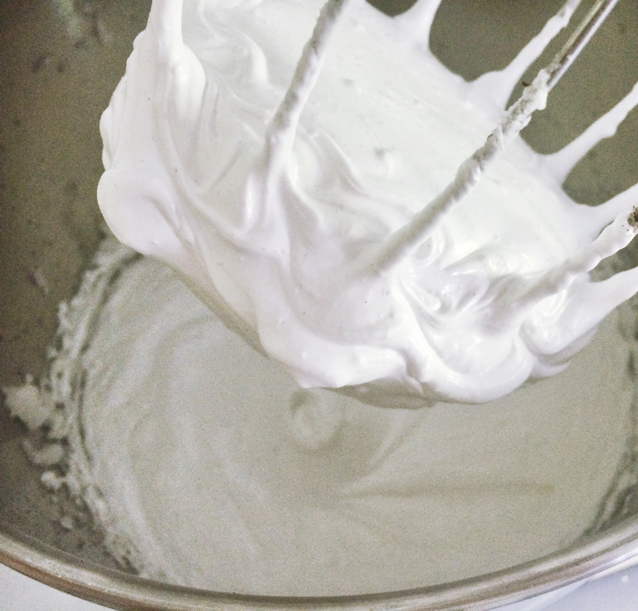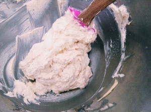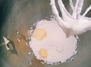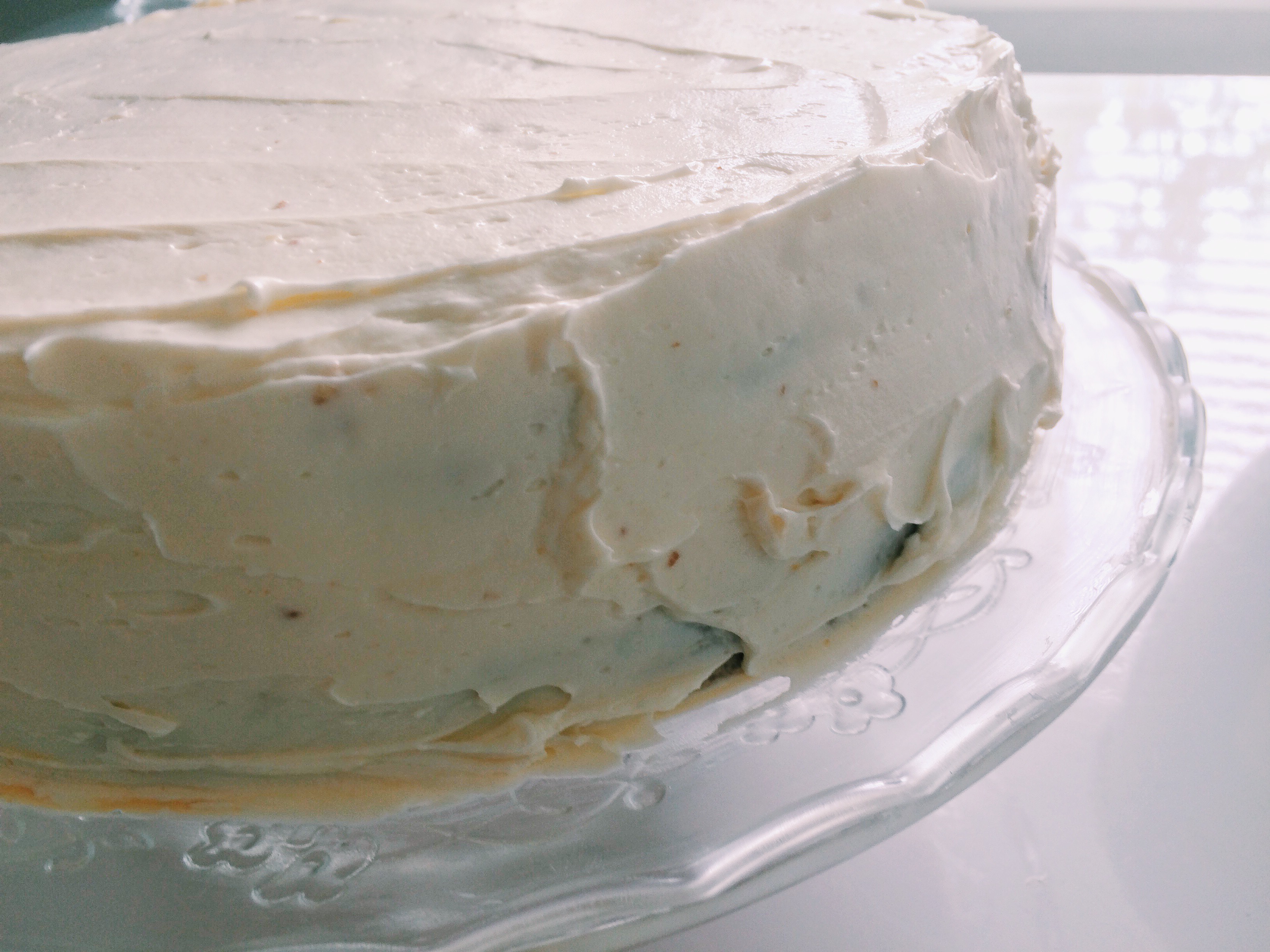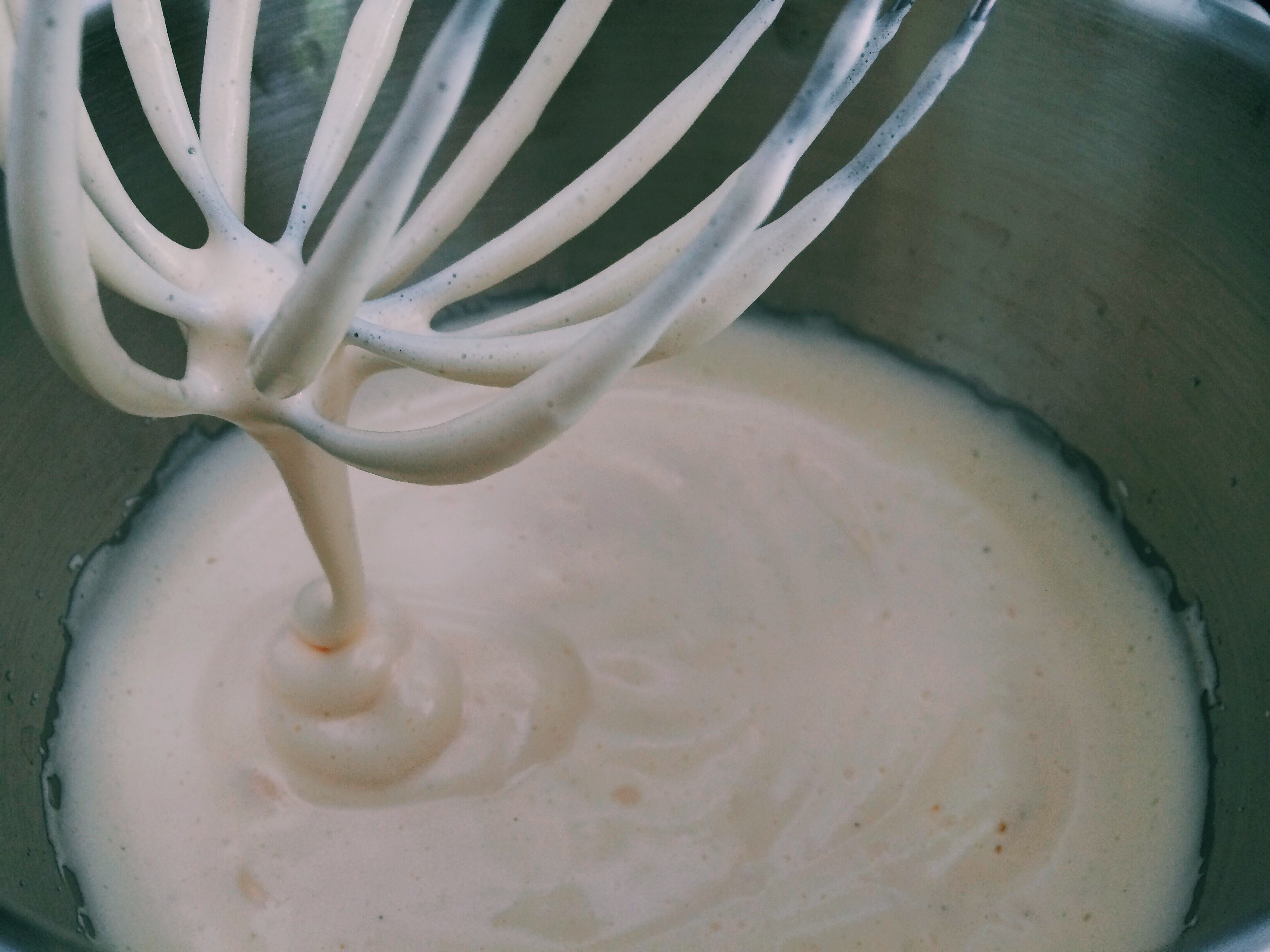 11) Lisää mascarpone ja vatkaa kunnes kuorrute on kauniin vaaleaa ja tasaista. Tässä kohtaa minulla on tätä kakkua ekaa kertaa tehdessä meinannut itku tulla, kun vaahto on 10 minuutin vatkaamisenkin jälkeen näyttänyt munakokkelilta. Ongelma on ilmeisesti ollut liian kylmä mascarpone ja voi. Ongelma ratkeaa, kun seoksen käyttää erittäin pikaisesti mikrossa varovaisuutta käyttäen, jotta se ei kuumene. Muutama sekunti riittää, jotta ainekset pehmenevät ja vatkausta jatkaessa seos muodostuu unelmanpehmeäksi ja kauniiksi.