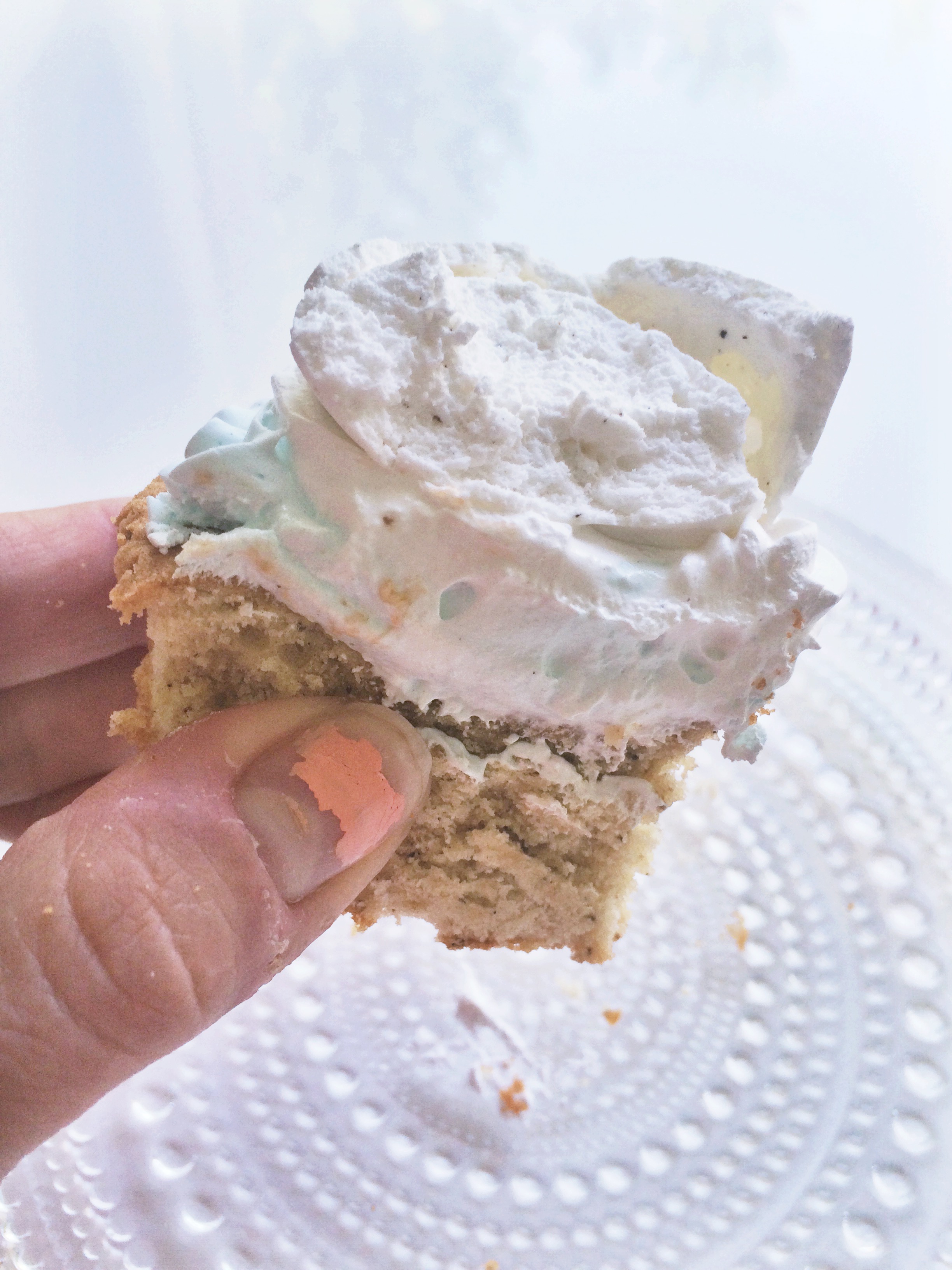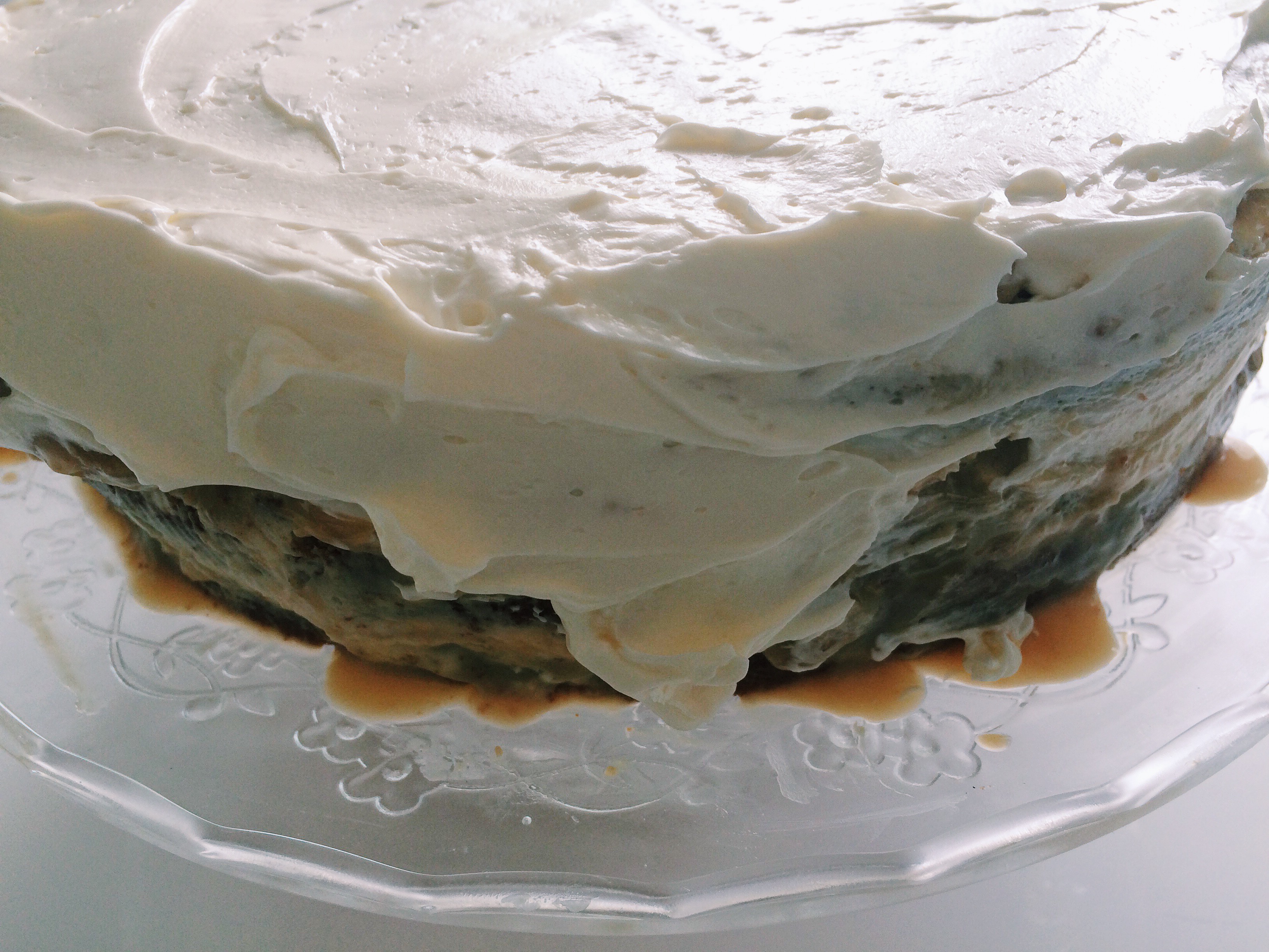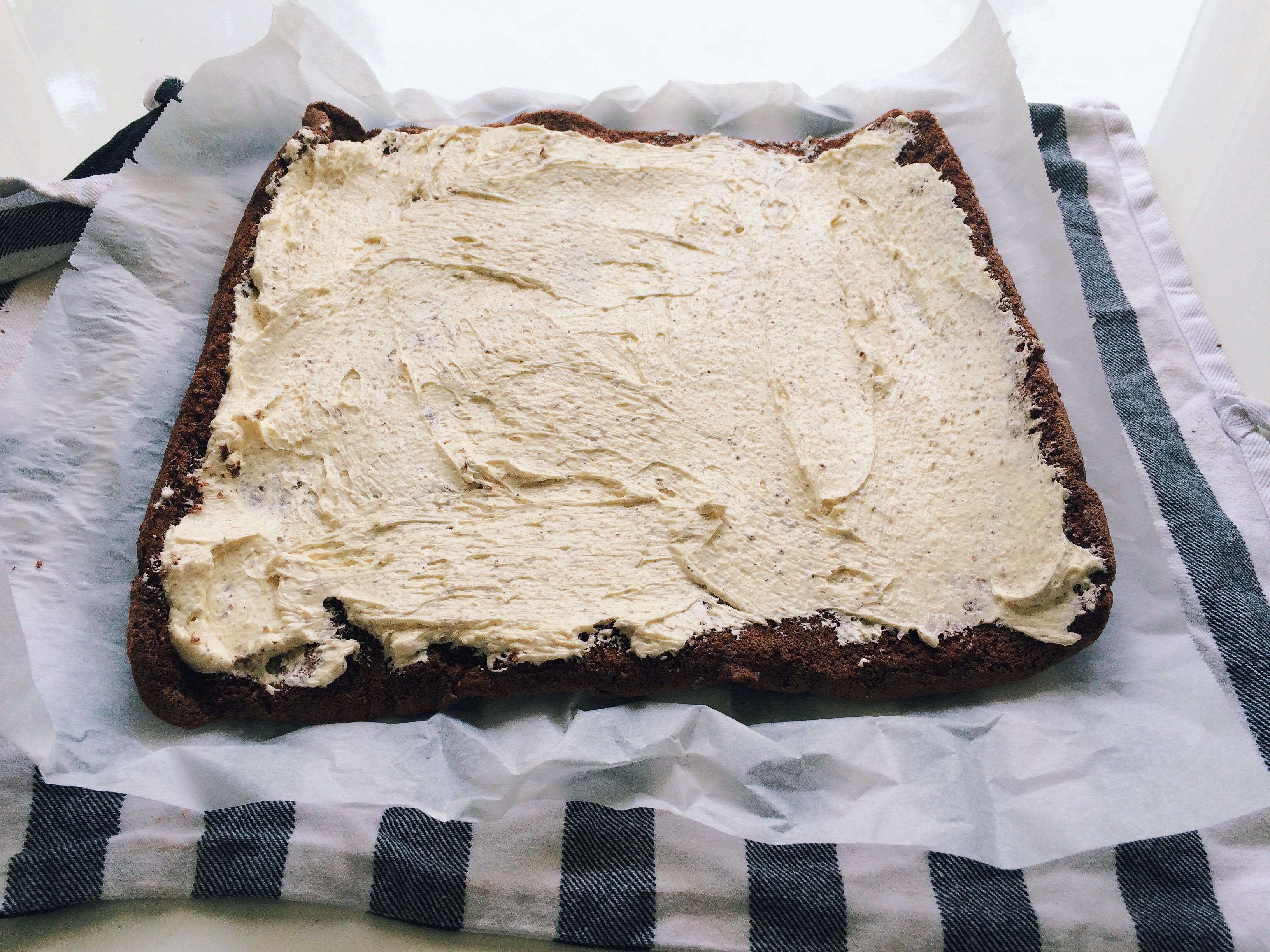 11) Lisää mascarpone ja vatkaa kunnes kuorrute on kauniin vaaleaa ja tasaista. Tässä kohtaa minulla on tätä kakkua ekaa kertaa tehdessä meinannut itku tulla, kun vaahto on 10 minuutin vatkaamisenkin jälkeen näyttänyt munakokkelilta. Ongelma on ilmeisesti ollut liian kylmä mascarpone ja voi. Ongelma ratkeaa, kun seoksen käyttää erittäin pikaisesti mikrossa varovaisuutta käyttäen, jotta se ei kuumene. Muutama sekunti riittää, jotta ainekset pehmenevät ja vatkausta jatkaessa seos muodostuu unelmanpehmeäksi ja kauniiksi.