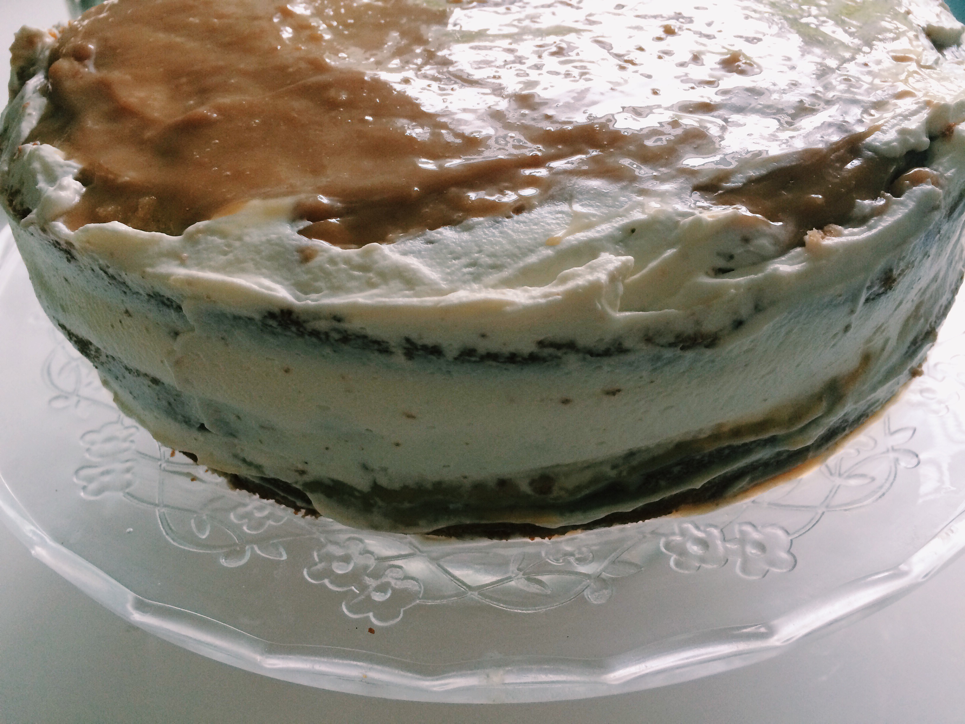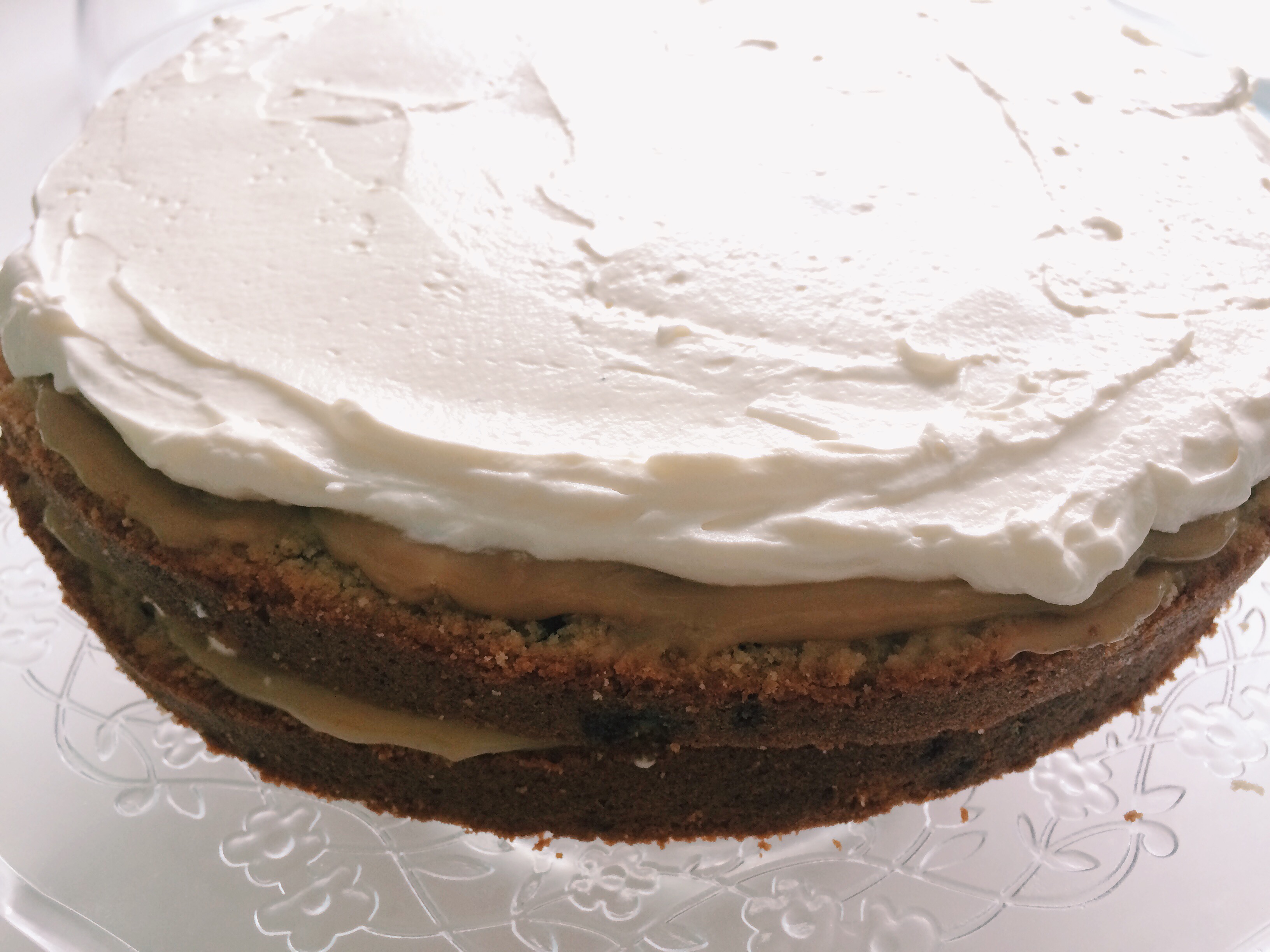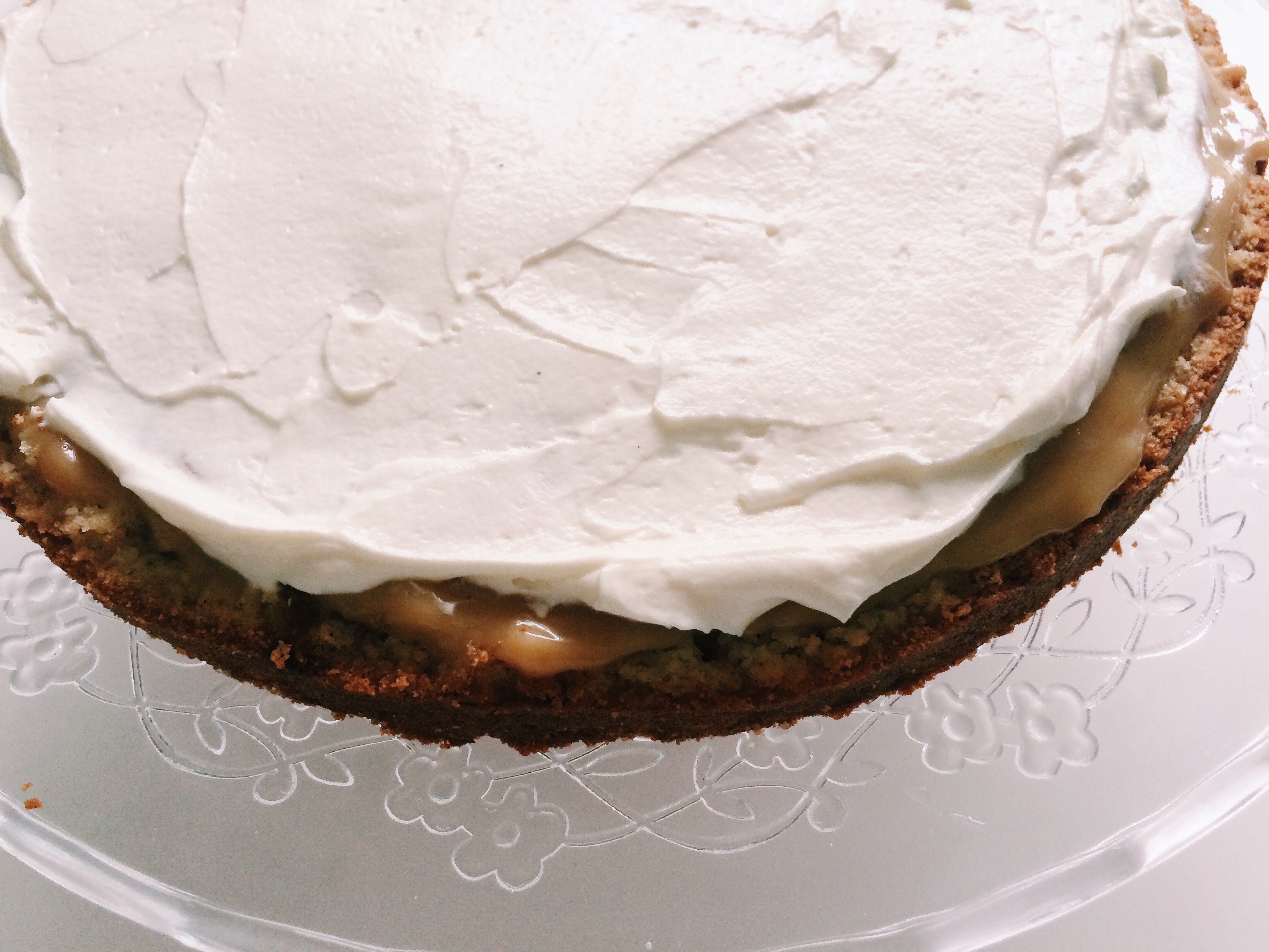 9) Täytä ja kokoa kakku. Levitä jokaisen kolmen pohjan päälle kerros kinuskia.