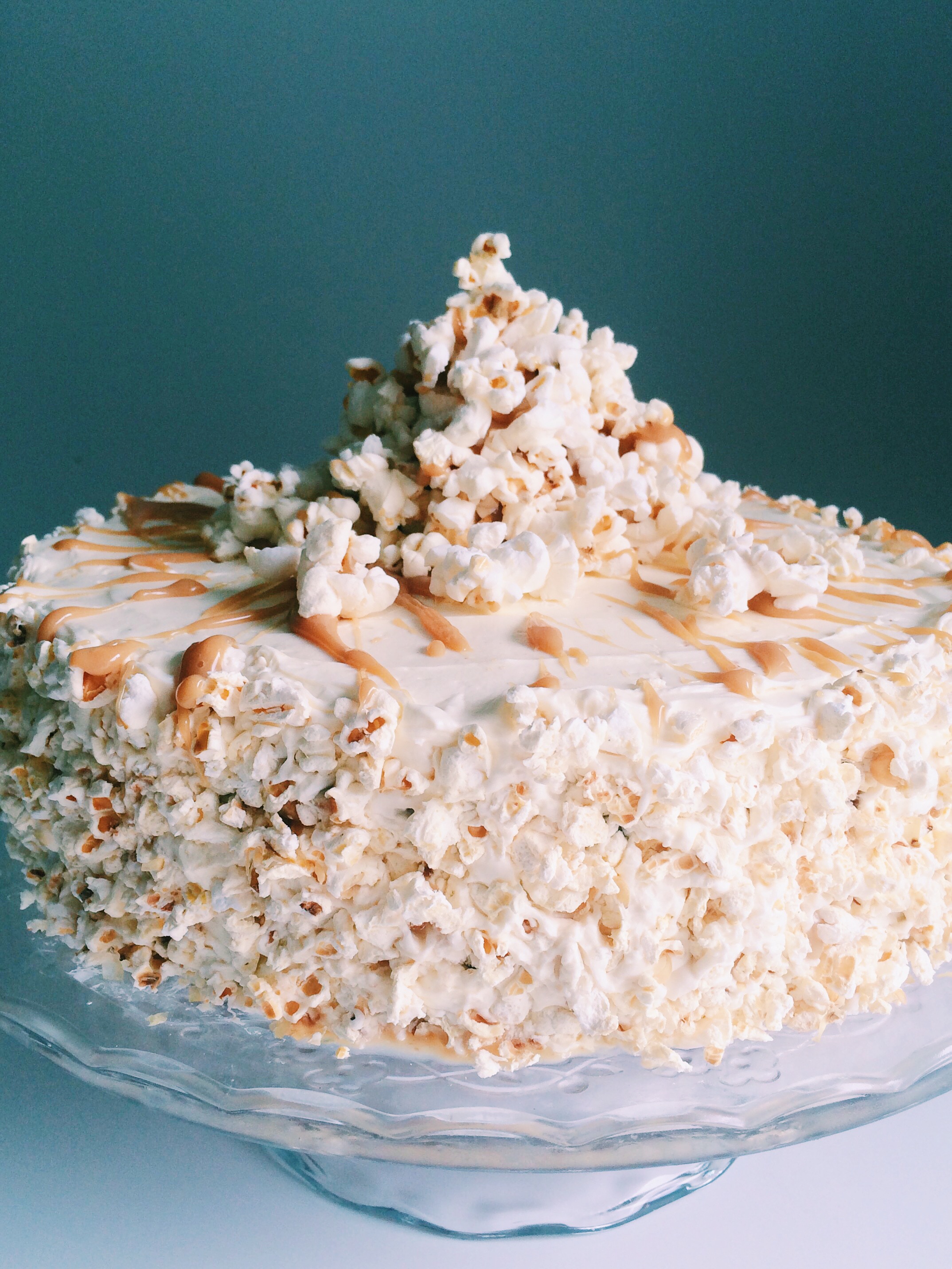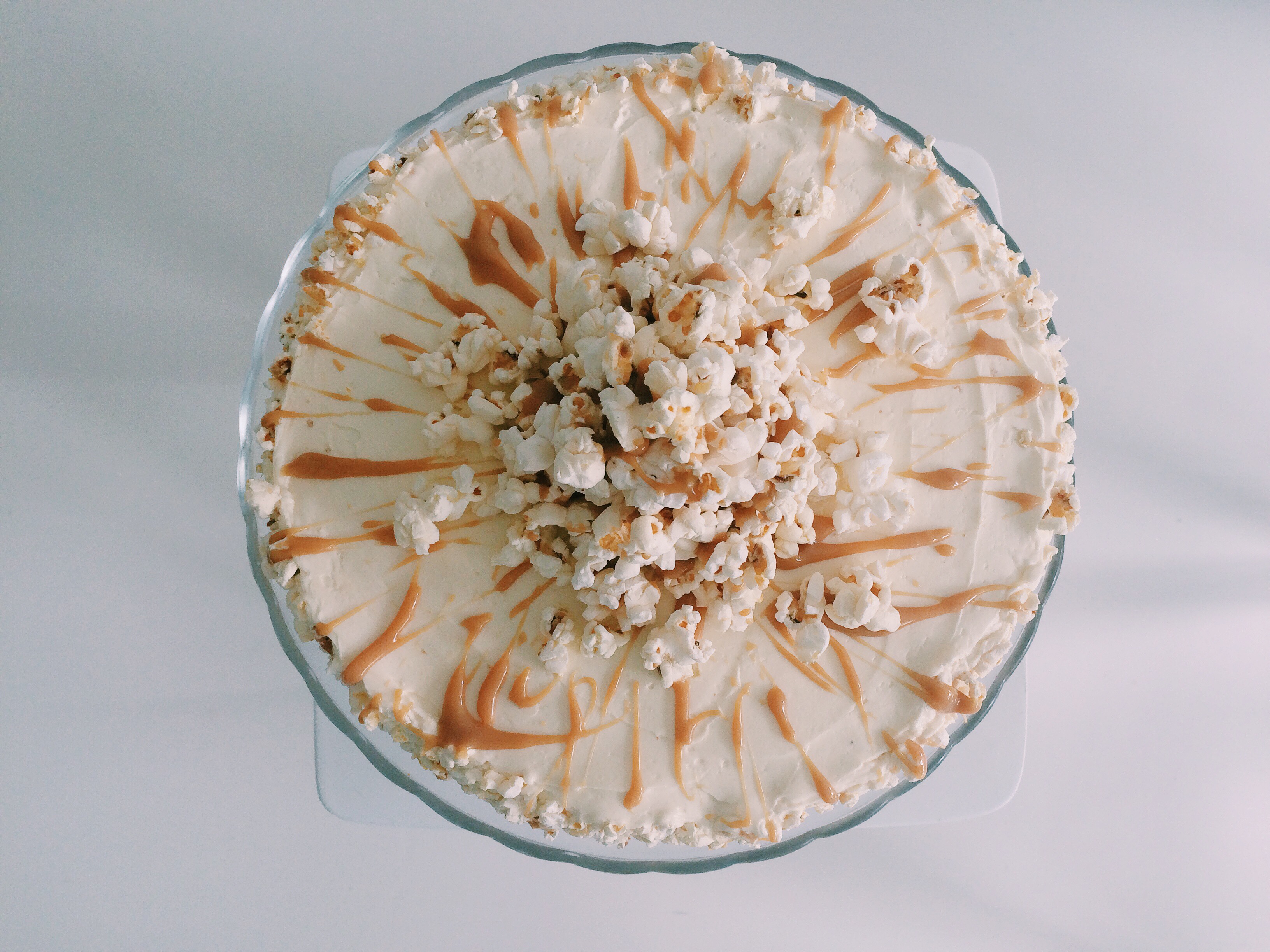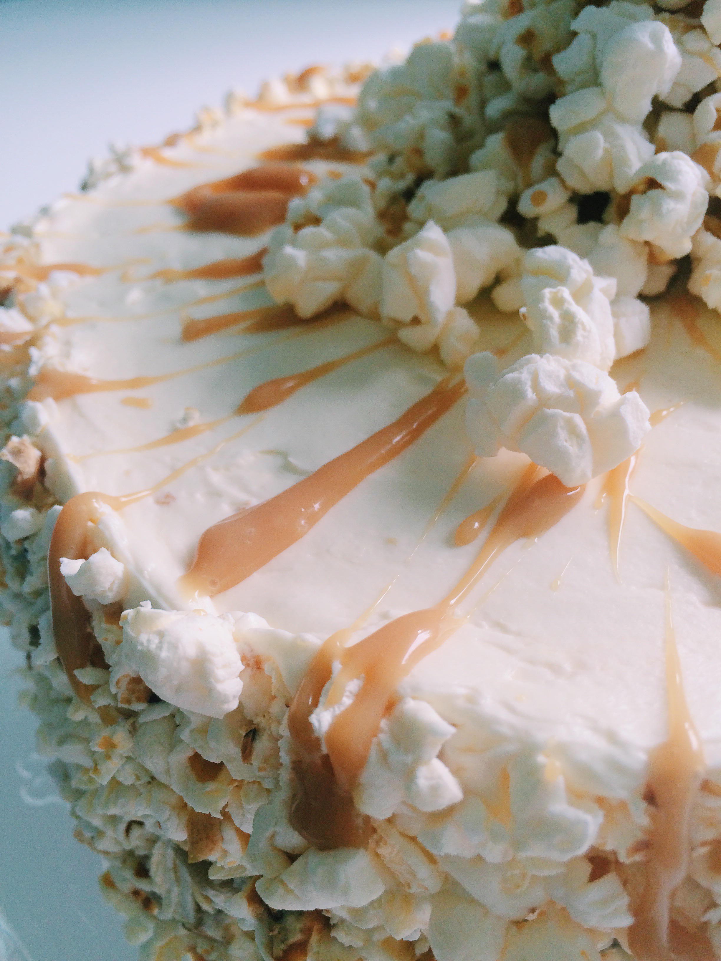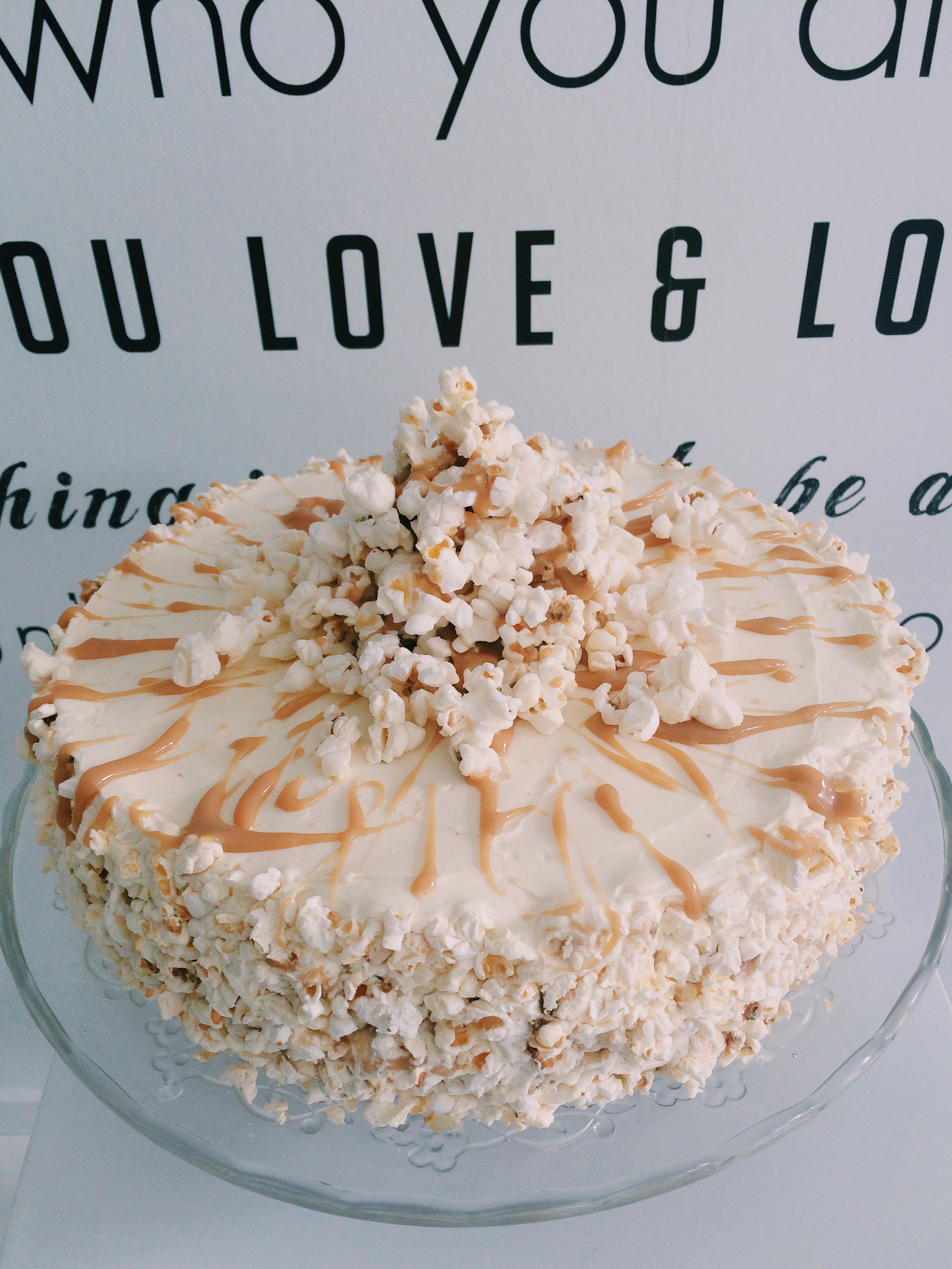 Okei, nyt en oikein tiiä mistä ja miten aloittaa tän kakun kaa. Tämä on nyt se paljon puhuttu popcorn-kinuskikakku, joka on maistuvan makeaa, suloisen suolaista ja samalla melko raskasta mutta silti tai juurikin siksi niin kovin koukuttavaa. Onneksi makeuden puolesta pienen pieni siivu kakkua riittää. Toisaalta, niitä pienen pieniä siivuja voi syödä yhden, toisen, jos kolmannenkin.