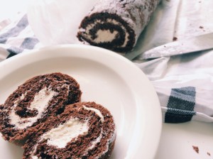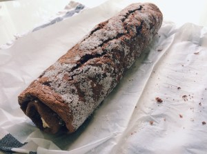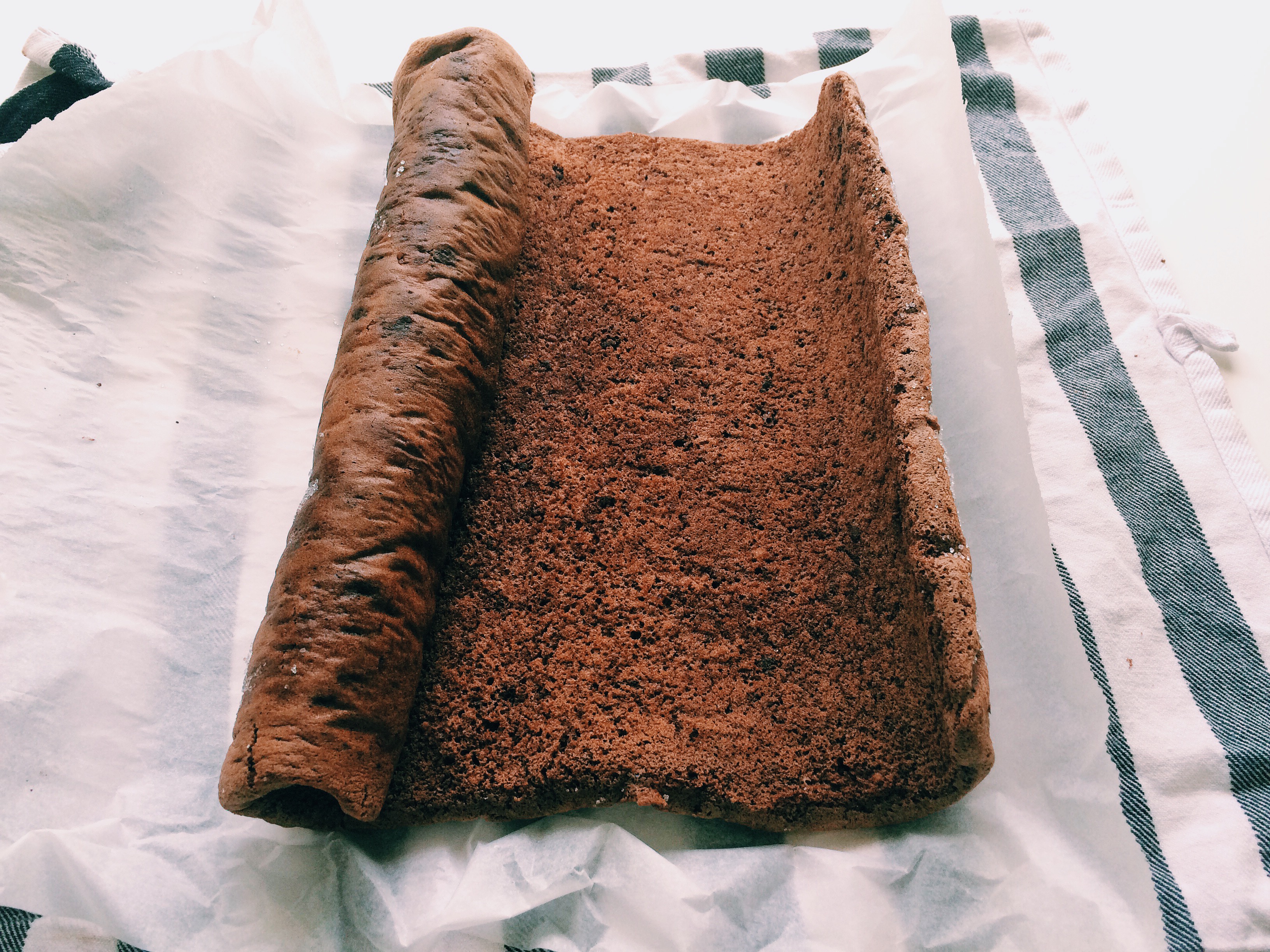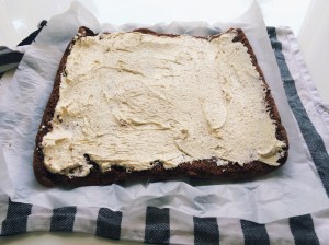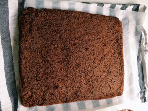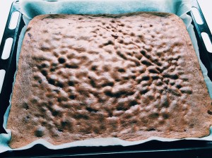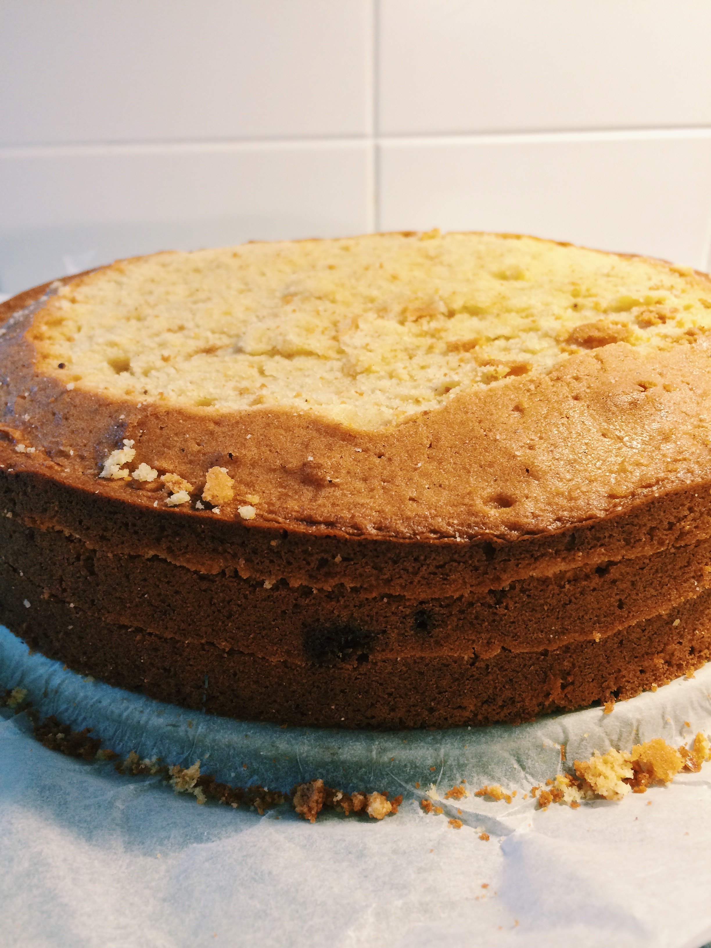 5) Tasoita jäähtynyt kakkupohja päältä veitsellä ja leikkaa sen jälkeen kolmeen osaan tasapaksuiksi kerroksiksi. (Itse tein kakkupohjan jo etukäteen tulevaa varten ja pakastin sen valmiiksi leikattuna, pohjakerrokset pinottuina. Pohja kestää hyvin pakastuksen ja otettuani pohjan ajoissa sulamaan, oli kakku helppo ”käyttöpäivänä” vain kostuttaa, täyttää ja kuorruttaa.)