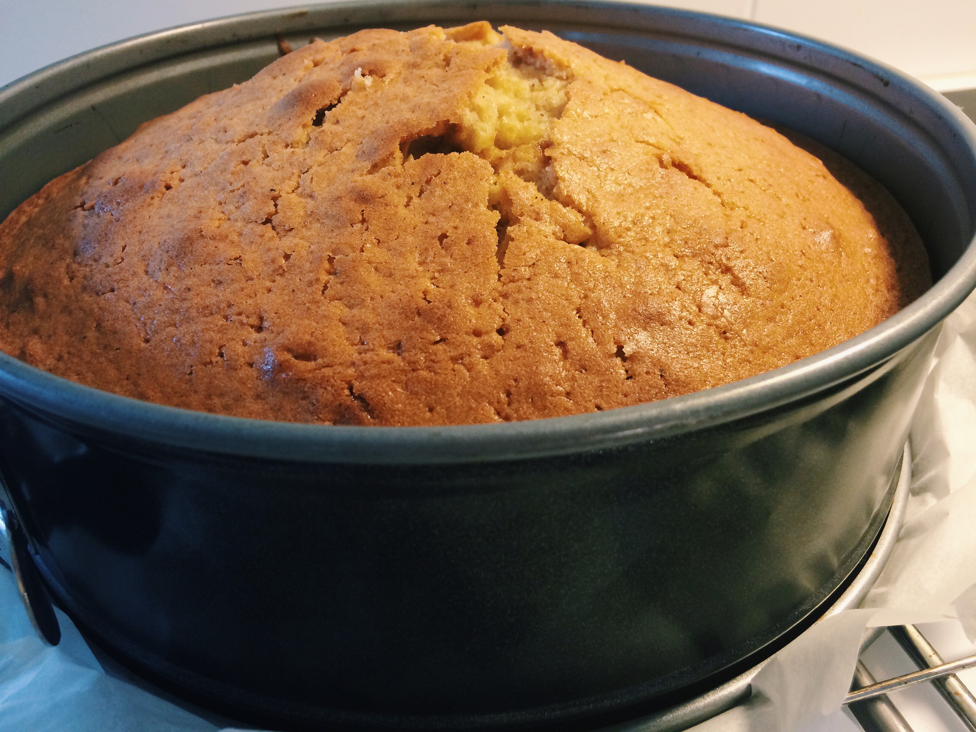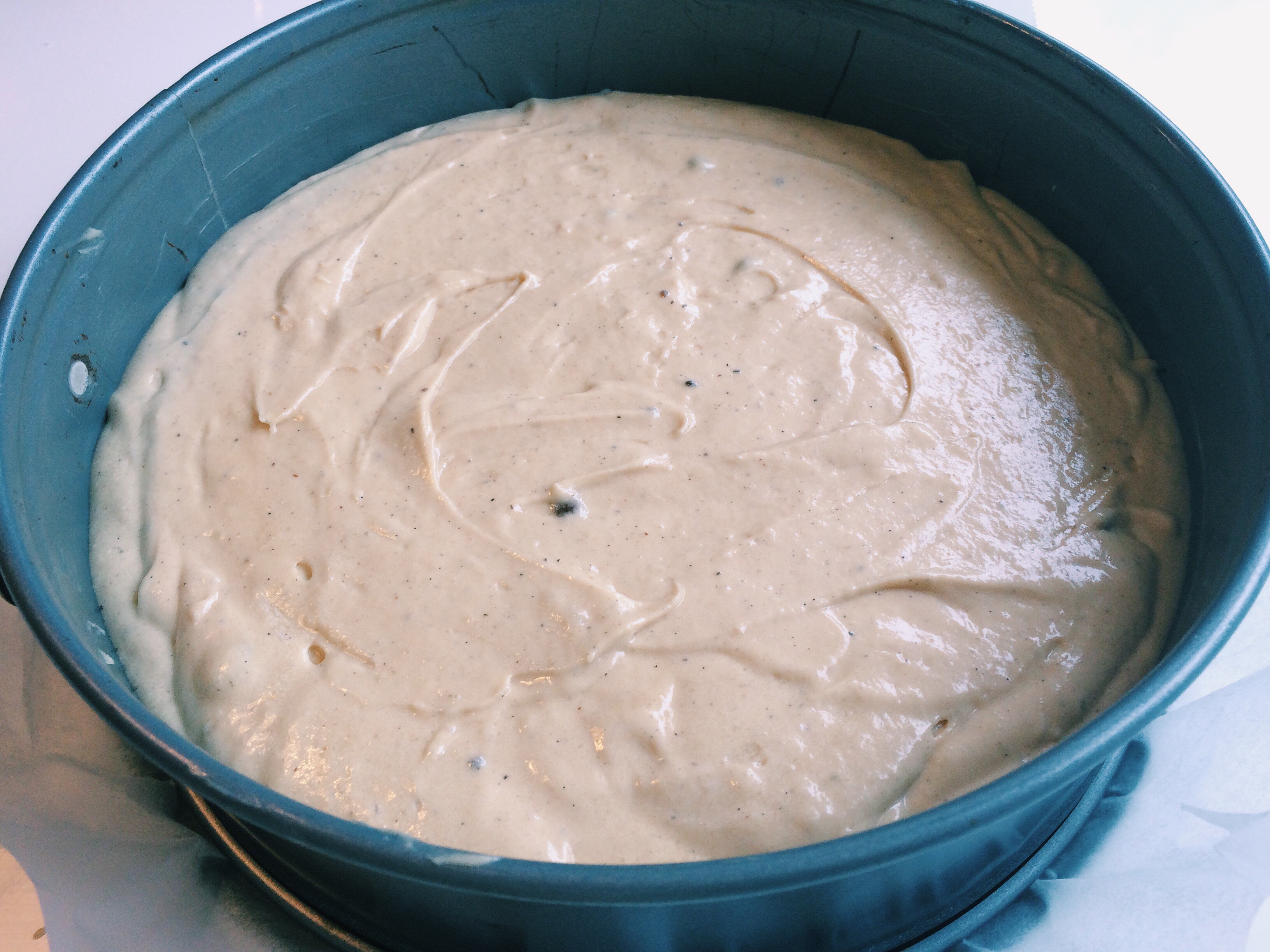 4) Kaada taikina irtopohjavuokaan ja paista 175 asteessa noin tunti uunin keskitasolla. Voit testata kypsyyttä puutikulla. Kakku on valmis, kun tikkuun ei enää tartu taikinaa! Anna jäähtyä ja irrota kakkupohja vuoasta.