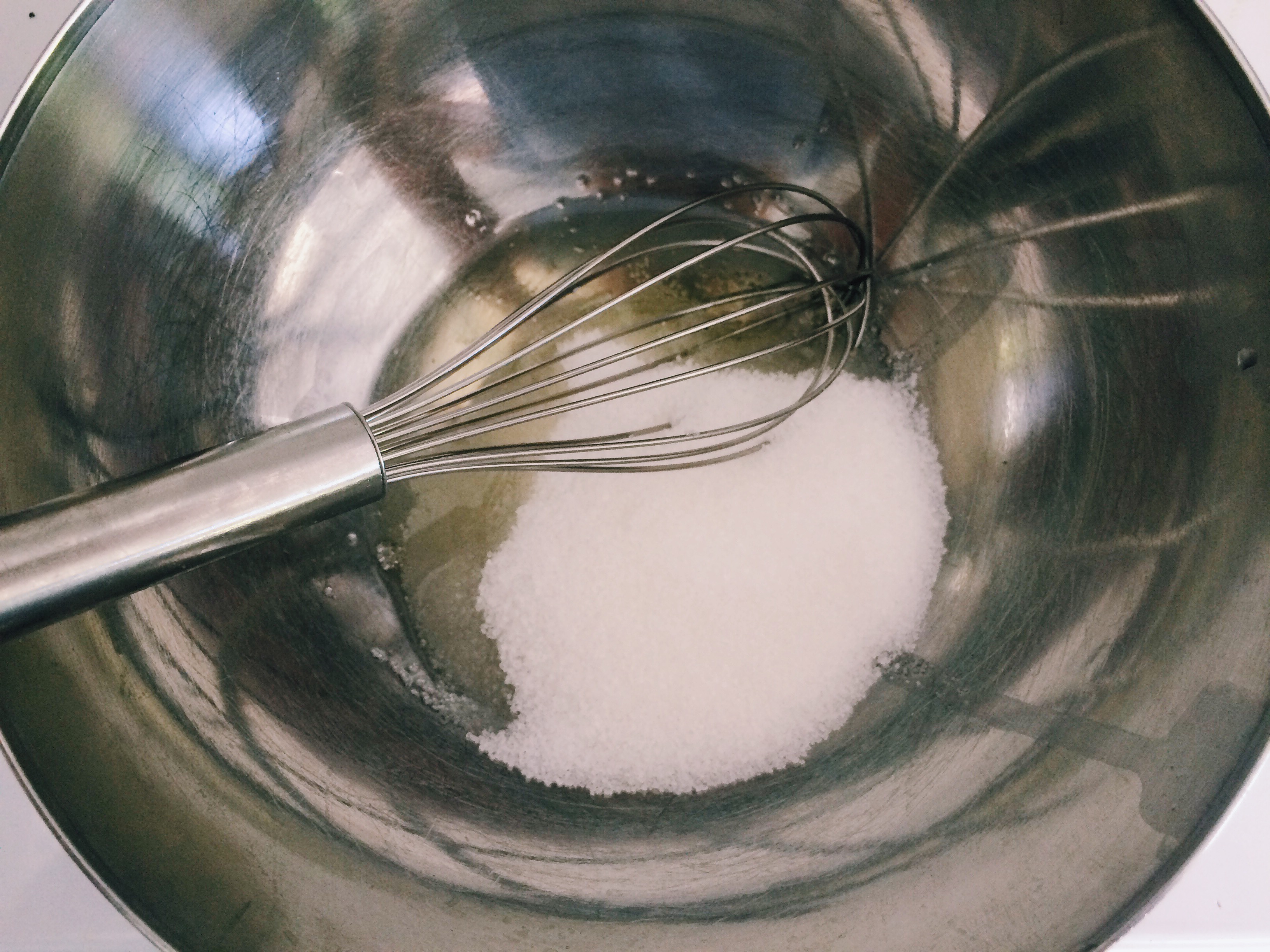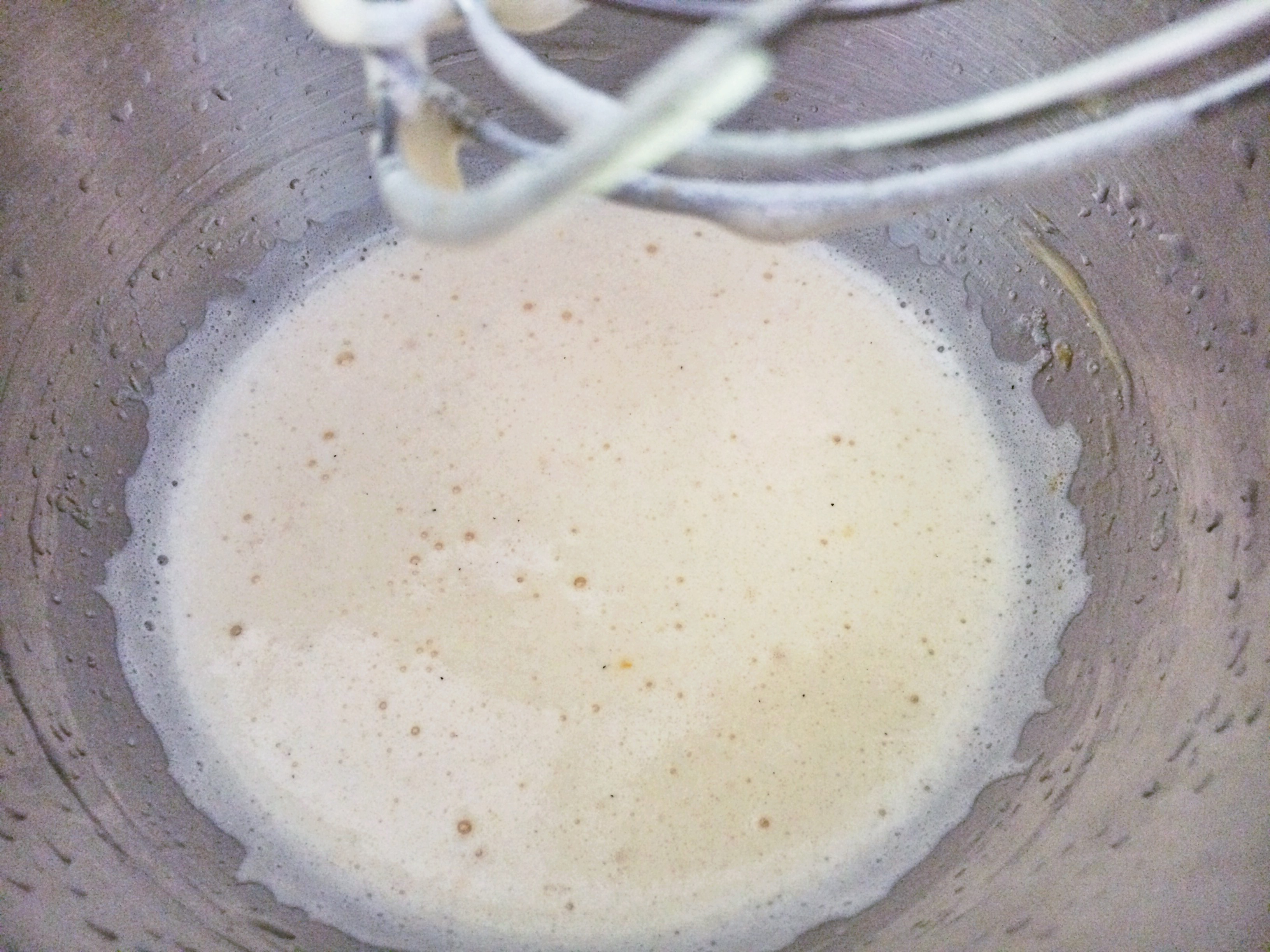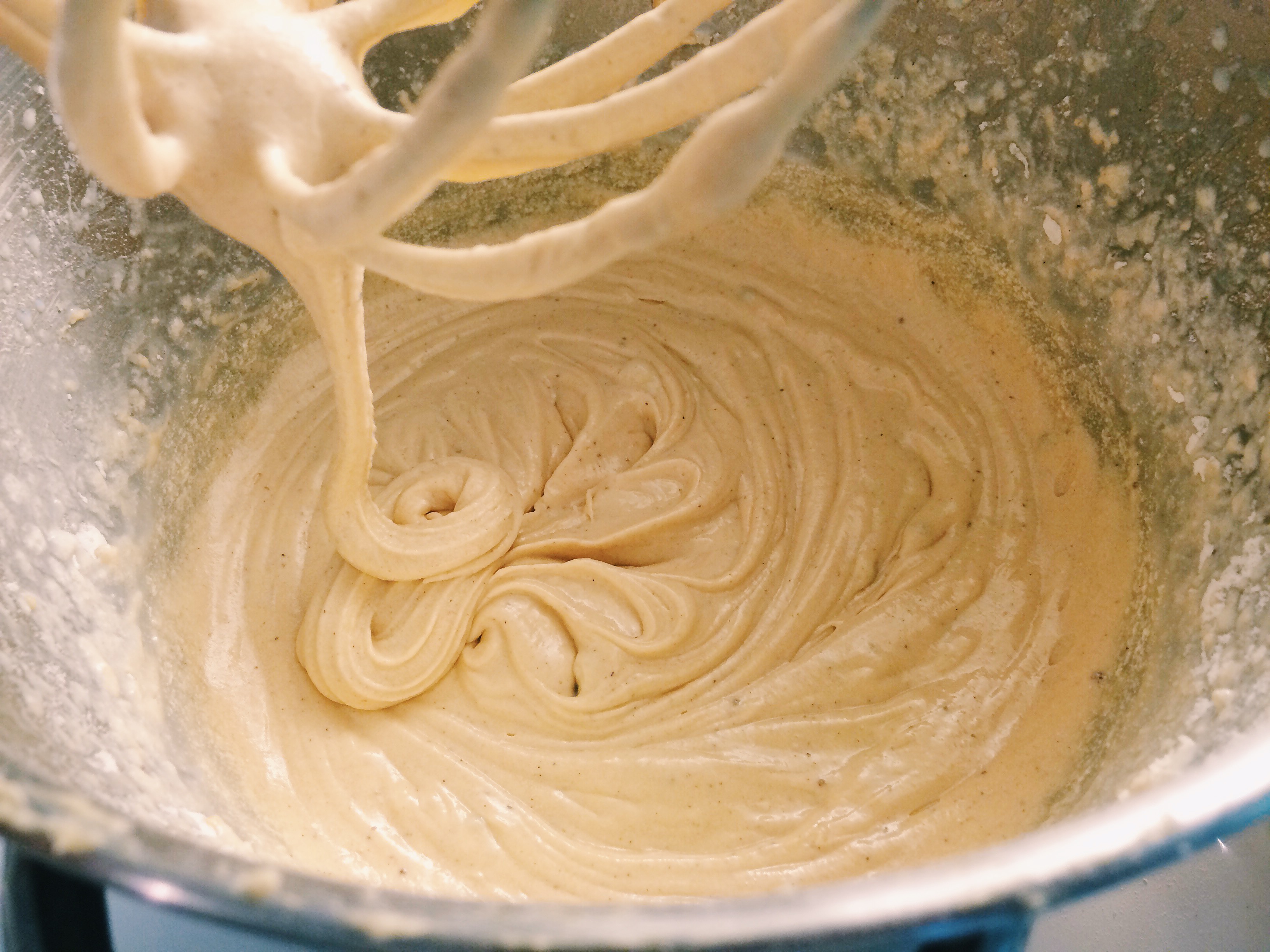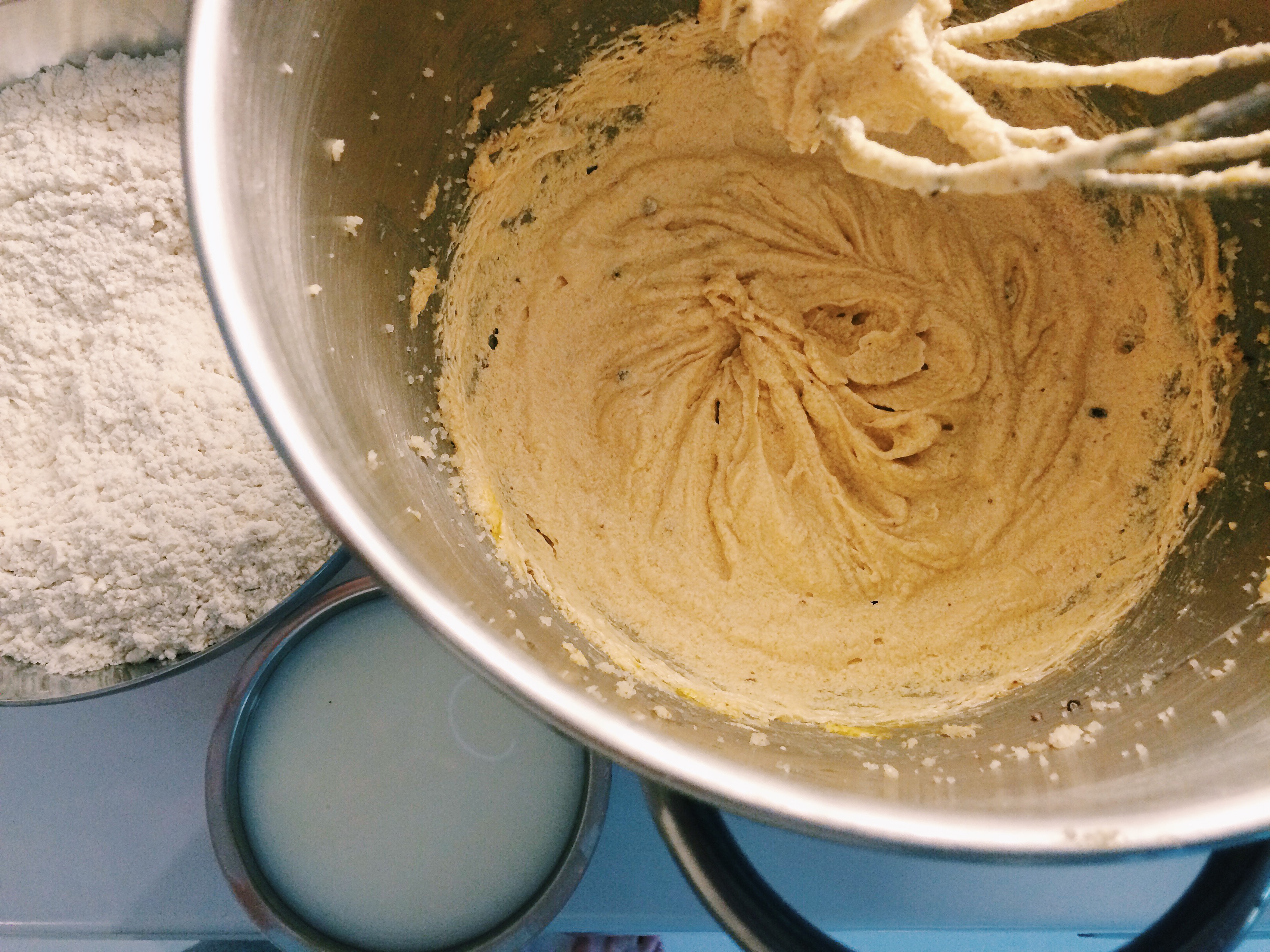 2) Vatkaa huoneenlämpöinen, pehmeä voi (sulata ihan hiven mikrossa, jos on liian kovaa) ja sokeri kuohkeaksi, vaaleaksi vaahdoksi yleiskoneella tai sähkövatkaimella.