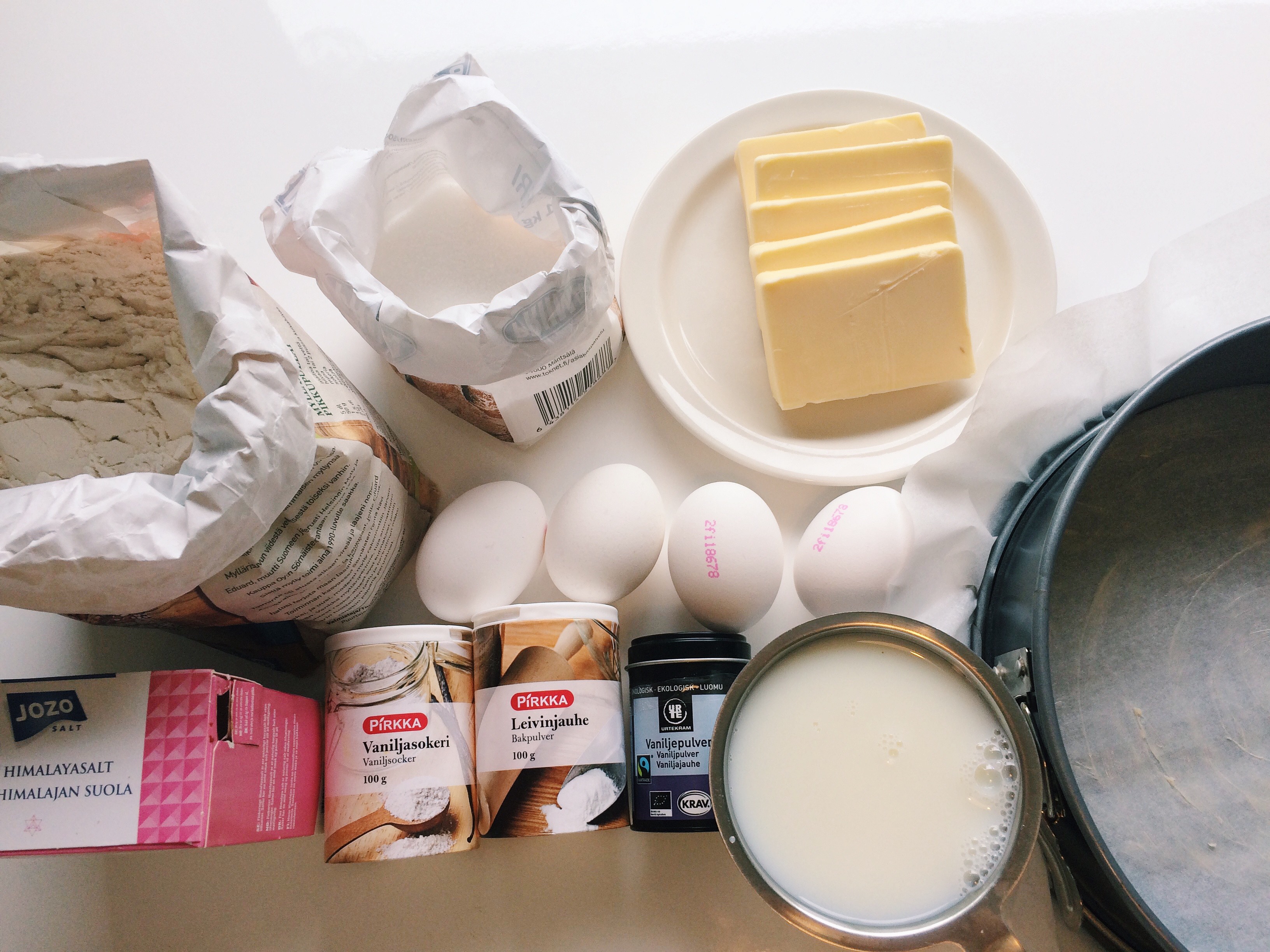 1) Aloita kakkupohjalla. Lue ohjeet, ota aineet huoneenlämpöön ja laita uuni lämpeämään 175 asteeseen tasalämmöllä. Laita irtopohjavuoan pohjan päälle leivinpaperi ja voitele vuoka.