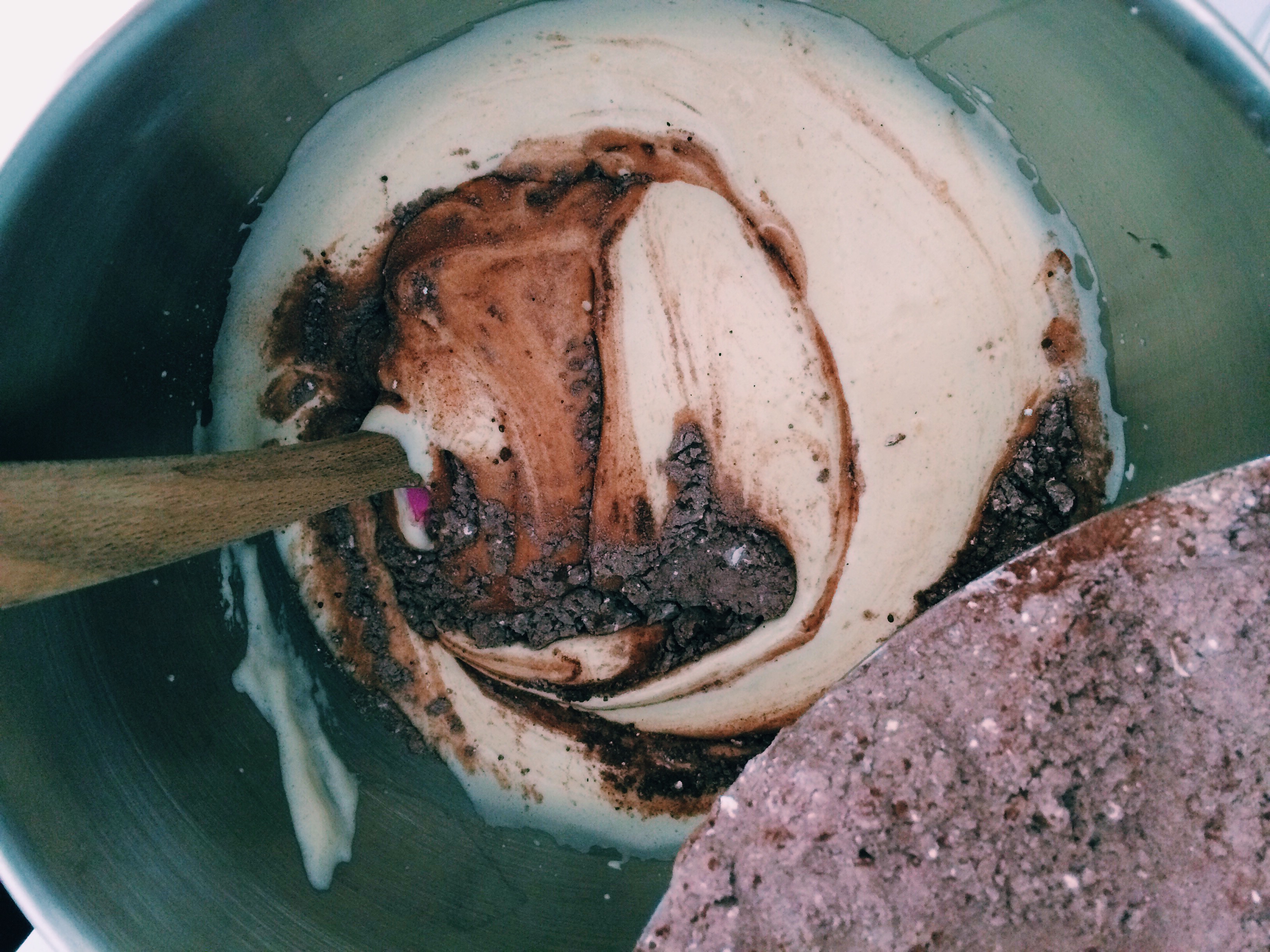 7) Jos käytät kondensoitua maitoa, keitä maito kinuskiksi hyvissä ajoin. Purkki upotetaan kokonaisena kattilaan veden alle ja keitetään kevyesti kiehuvassa vedessä 2,5 tuntia. Itsehän hätäilin ja 2 tuntia ei ollut ihan riittävä aika kahdelle tölkille.