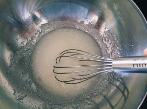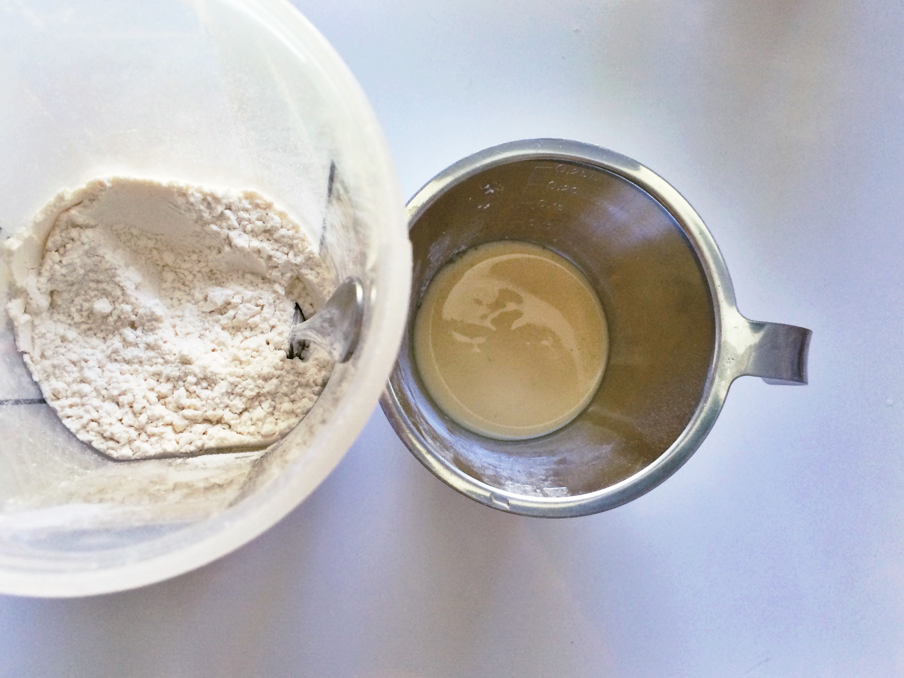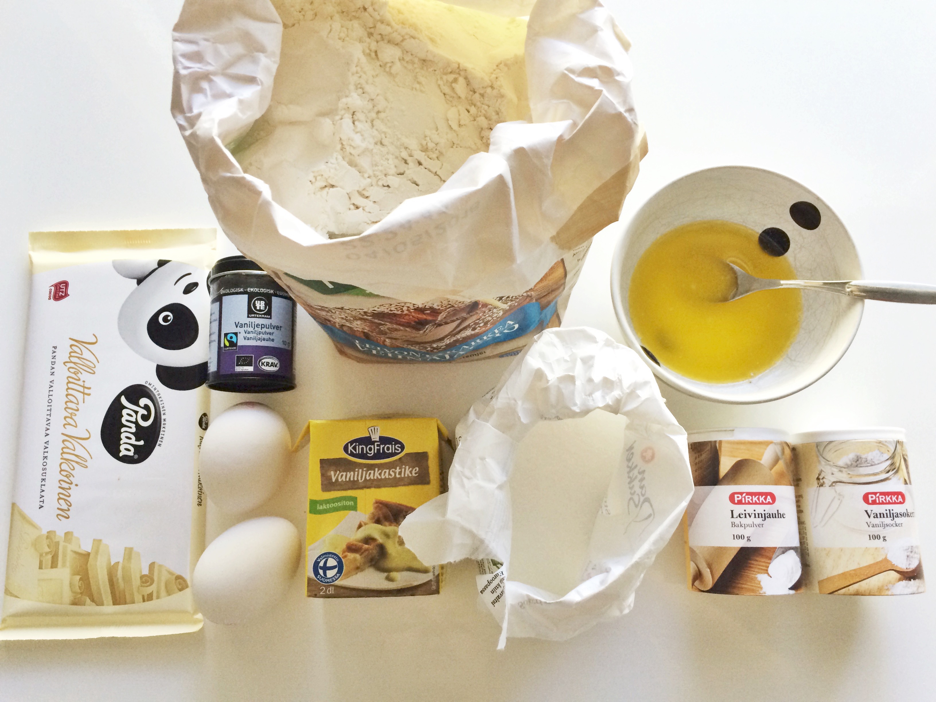 3) Sekoita keskenään kuivat aineet (vehnäjauhot, leivinjauhe, suola, vaniljasokeri ja -jauhe), lisää ne voi-kananmuna”vaahdon” sekaan maidon kanssa vuorotellen. Vatkaa kuohkeaksi!