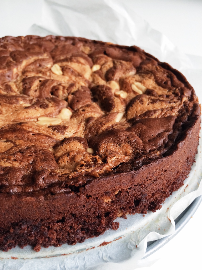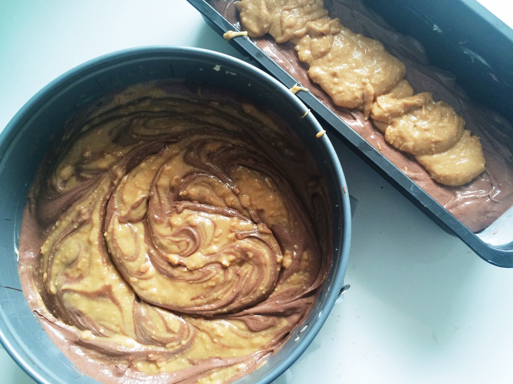 10) Nostele maapähkinätahna lusikalla vuokiin brownietaikinan päälle. Vedä veitsellä pyöreitä kuvioita pohjaa myöten molempien taikinakerrosten läpi siten, että taikinan pinta marmoroituu. Toisaalta omissani kypsyessä pinta eli ja kohoili hieman, joten marmorointi ei mitenkään oikeuksiinsa päässyt mutta maullisesti pääasia, että kaksi eri taikinaa sekoittuu valmiissa tuotoksessa. Pinnalle voi oman maun mukaan ripotella suolapähkinöitä enemmän tai vähemmän.