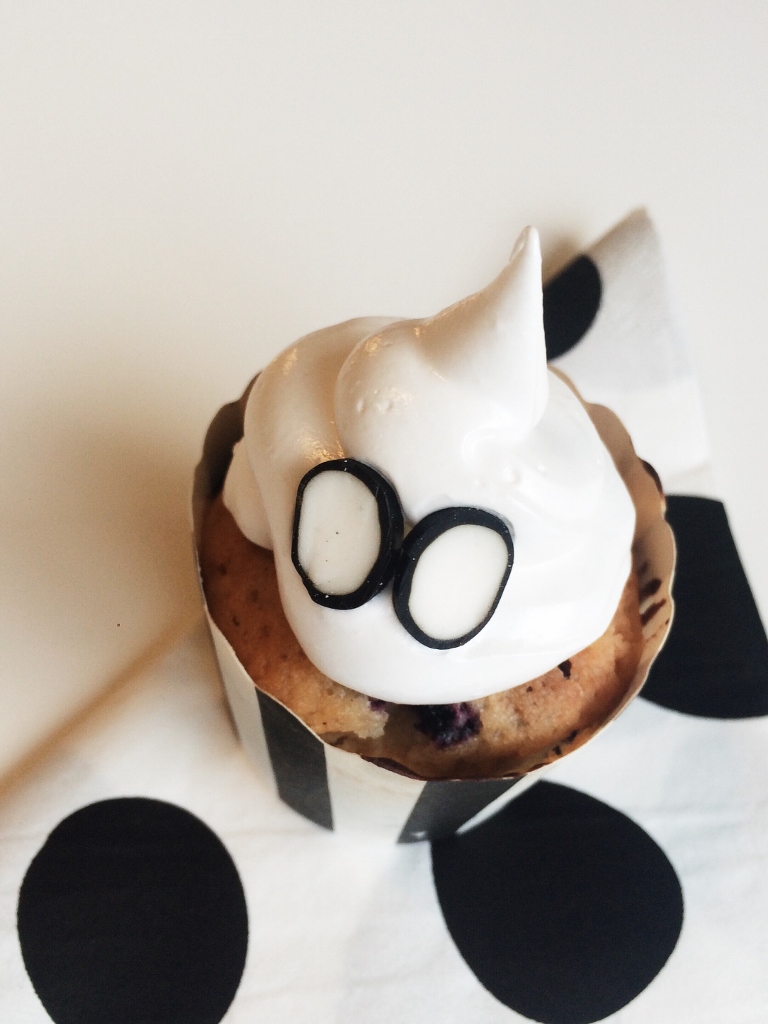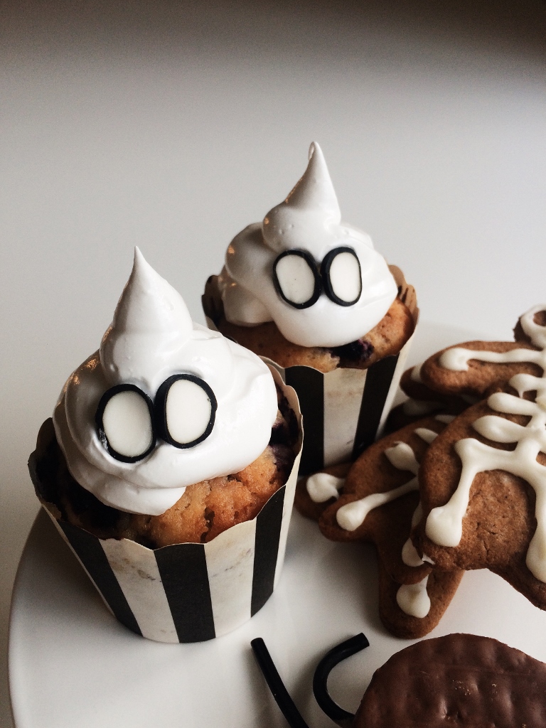 Viimeisimpänä vähän enemmän (mutta vain vähän) vaivaa vaativat kummitusmuffinssit, jotka tein luottoreseptini muffinssipohjaan täytteenä mustikat ja reilu ruokalusikallinen lemon curd -tahnaa. Päälle valmistetaan kiiltävä ja jämäkkä marenkikuorrute, jonka saa vaniljauutteella maustamalla maistumaan ihanalta. Ystäväni toi minulle tätä Krav-merkkistä vaniljauutetta Punnitse & Säästä liikkeestä siellä asioidessaan. Eri vaniljauutteita on saatavilla myös Ruohonjuuresta, joskaan normiruokakaupoista en vielä ole löytänyt. Toki marengit voi maustaa myös ihan vaniljasokerilla!