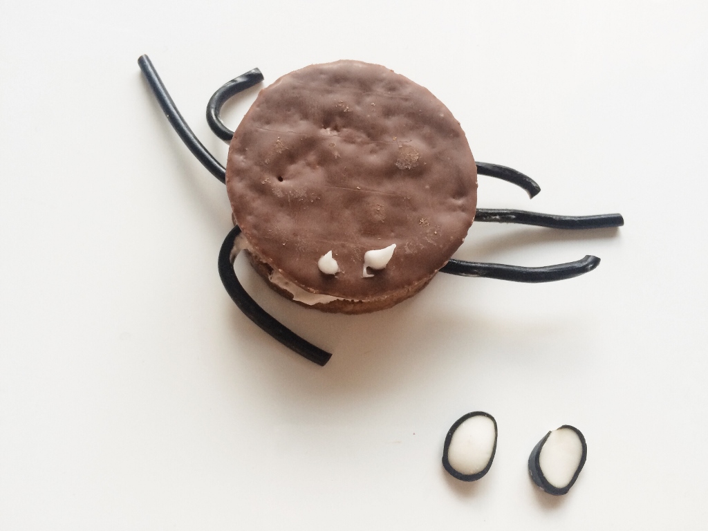 Vaivattomasti kaupan aineksilla saa kasattua myös kauhujen kerroskeksin, jonka väliin voi laittaa esimerkiksi jätskiä, kermavaahtoa, vaniljatuorejuustoa tai itsetehtyä marenkivaahtoa, jonka ohje seuraa jäljempänä. Juju on tehdä keksistä hämä-hämähäkki lakupötköstä pätkäistyillä silmillä ja Snören-lakunauhakoivilla. Silmät kiinnitin sokerikuorrutteella.