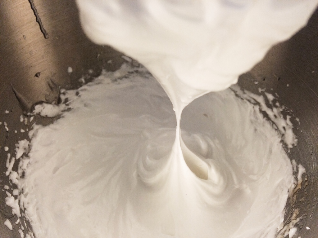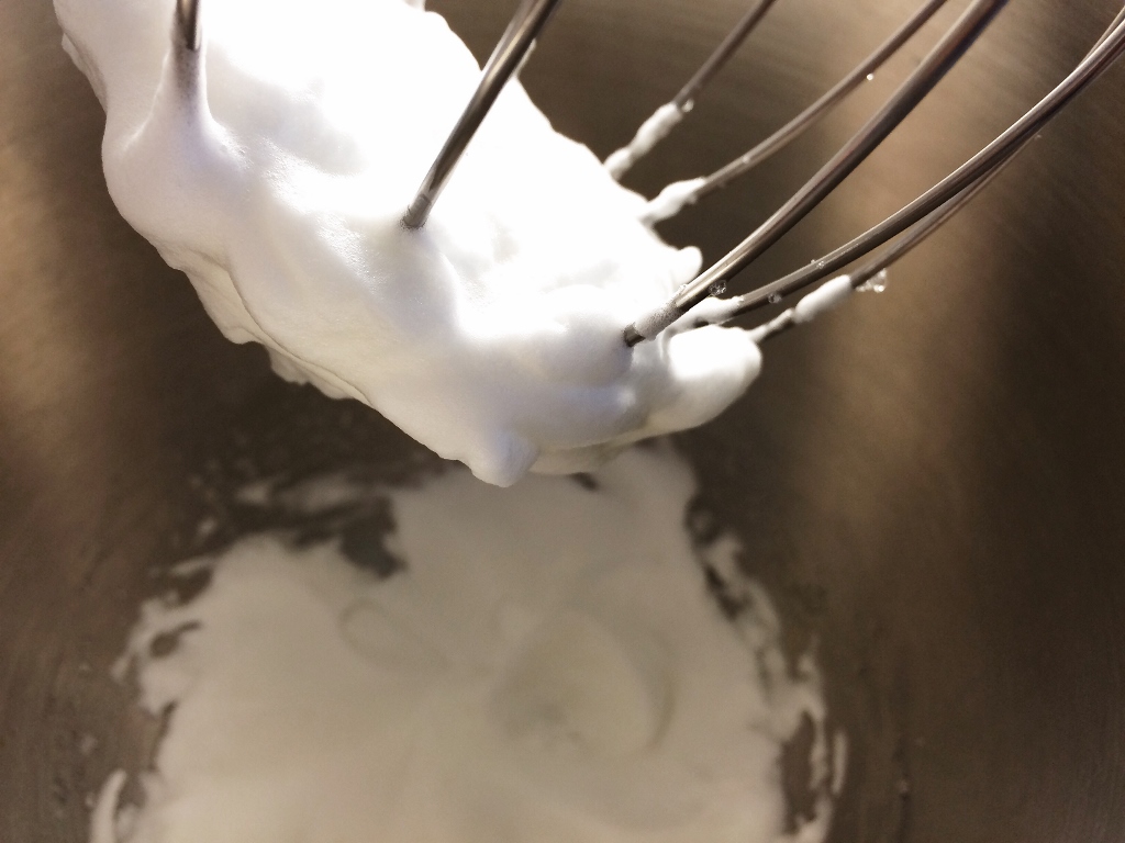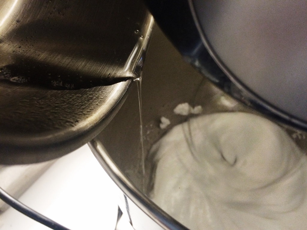 3) Kaada valmis sokeriliuos välittömästi ohuena vanana valkuaisvaahdon joukkoon. Jos käytössäsi on yleiskone, sen kannattaa antaa vatkata vaahtoa samanaikaisesti, kun sokeriliuoksen lisää! Vatkaa huolella niin kauan, että seoksesta tulee kovaa ja kiiltävän valkoista. Tämä vie noin viisi minuuttia. Lisää lopuksi mukaan sitruunamehu ja vaniljauute tai -sokeri.