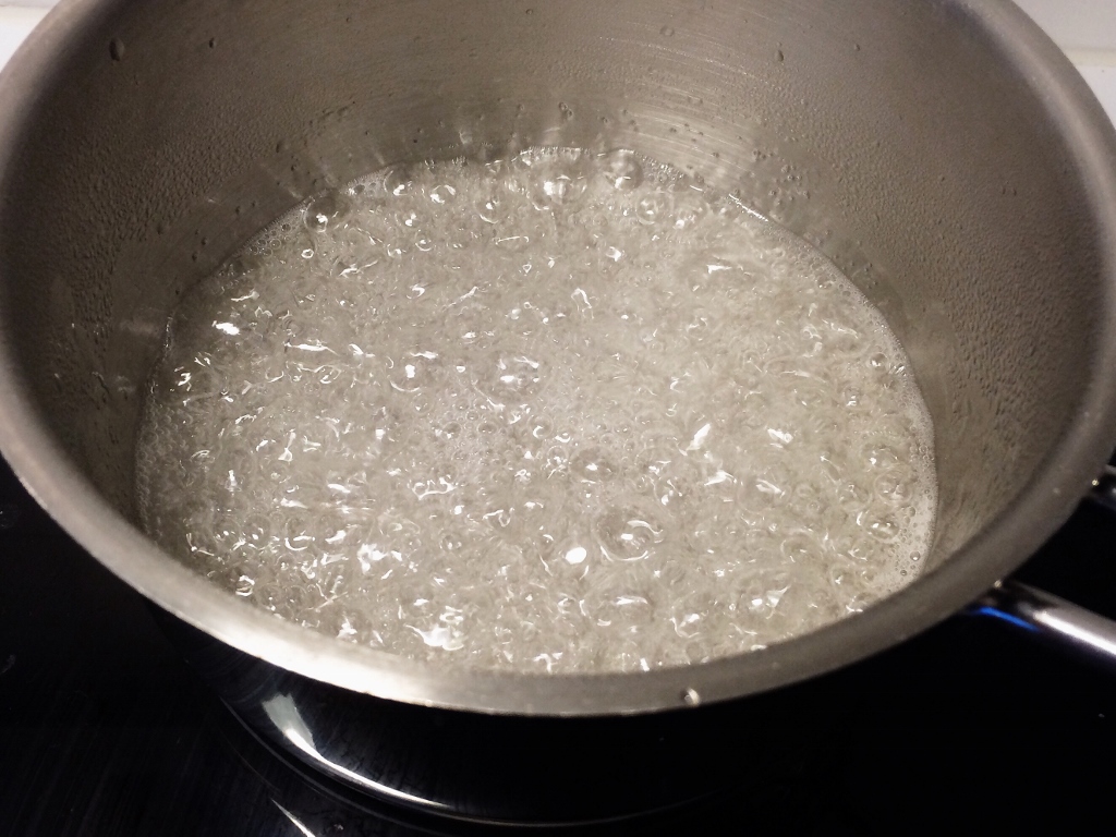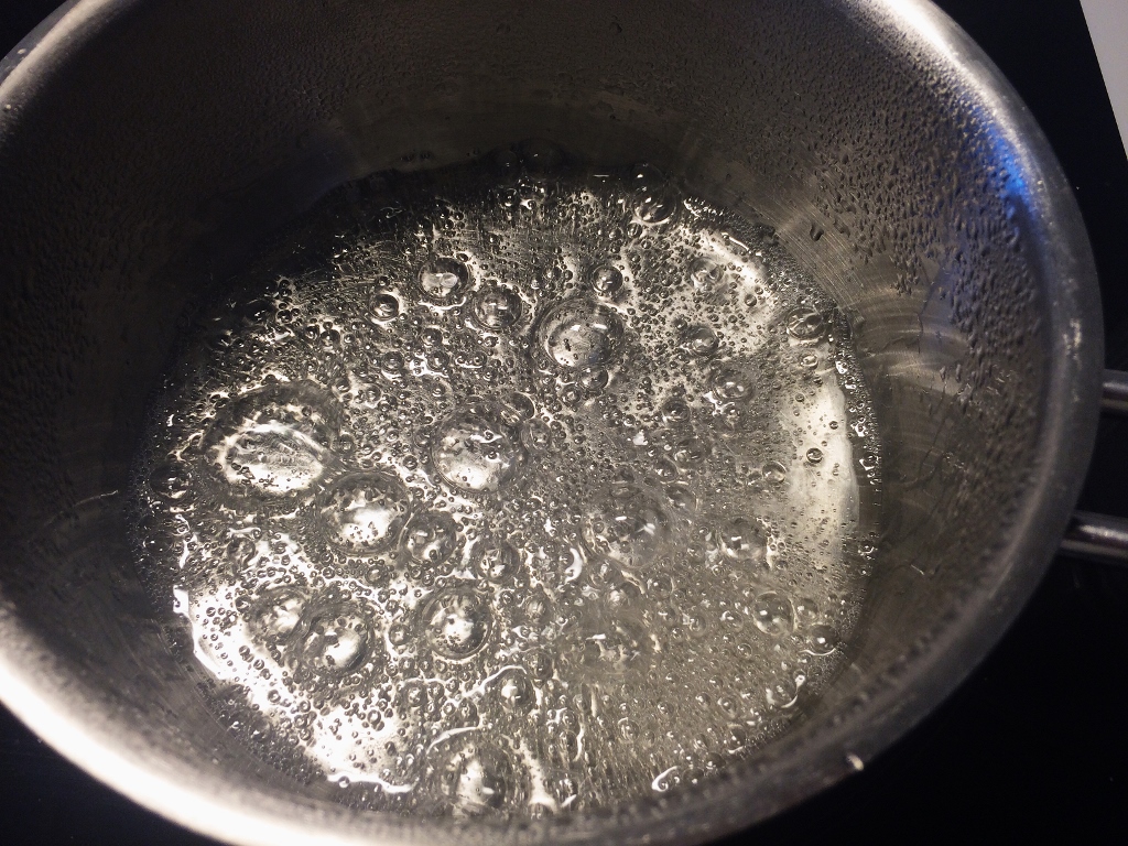 2) Mittaa pieneen kattilaan sokeri ja vesi, anna kiehua täydellä teholla niin kauan, että sokeri on täysin liuennut veteen ja seos on kirkasta. Tämä vie ohjeen määrällä pari minuuttia!