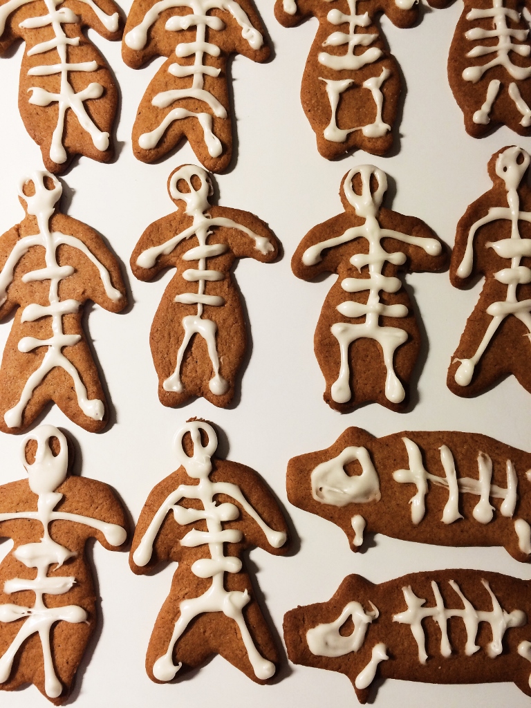 Tässähän taas kolkuttelee pikkujoulukausikin jo ovella, illat lyhenee ja kaupastakin saa glögiä, joten mikä ettei pipareitakin voi hyvin paistaa. Ostinkin kaupasta valmista piparkakkutaikinaa ja sokerikuorrutetta, joista syntyi nopeasti skidin avustuksella luurankopiparkakku-ukkoja, -akkoja ja -possuja.