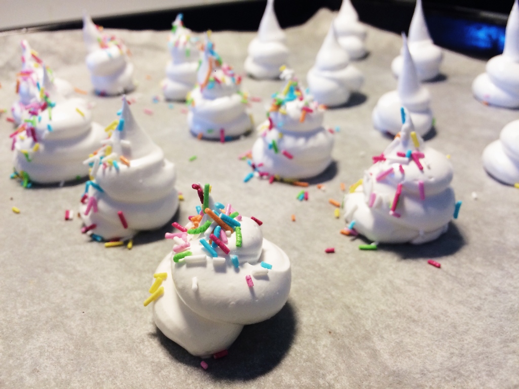 5) Jos teet marenkikoristeita niin valitse sopiva tylla esim. tähtitylla tai pursota marenkivaahto suoraan pussista pellille näteiksi keoiksi. Marengin voi koristella esim. strösselillä, sillä uunin alhainen lämpötila ei niitä sulata. Paista 100 asteessa keskitasolla noin 1-1,5 tuntia, sammuta uuni ja anna marenkien jäähtyä uunin mukana. Nosta huoneenlämpöön, kun marenkien pohja irtoaa leivinpaperista.
