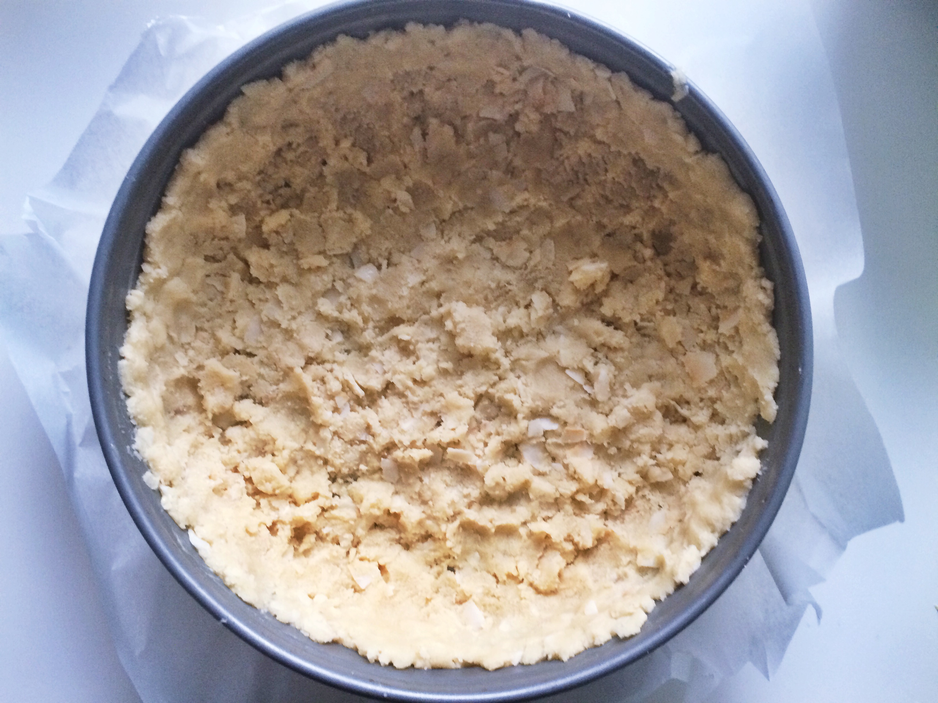 3) Valmista ensin pohja. Tämä onnistuu ilman sähkövatkainta vaikka ihan haarukalla! Sekoita pehmeä voi ja sokerit, lisää jauhot ja kookoshiutaleet/-lastut. Sormin nyppimällä saat taikinan vielä nopeammin valmiiksi kuin sillä haarukalla.