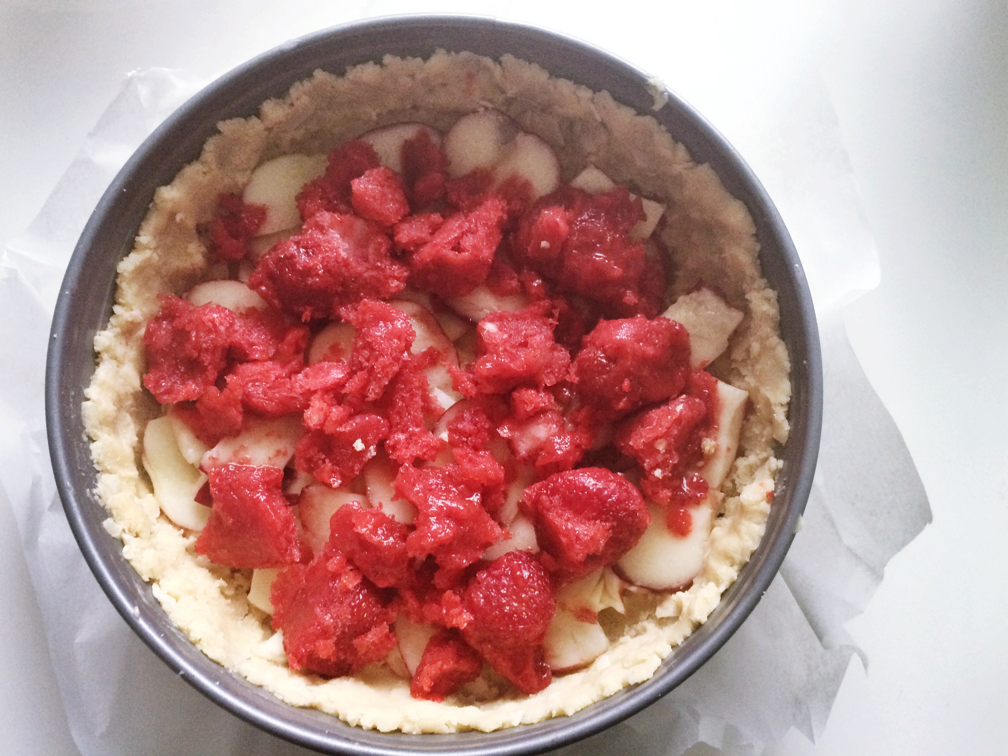 2) Laita uuni lämpenemään 200 asteeseen, laita leivinpaperi irtokakkuvuoan pohjalle ja voitele vuoka reilusti voilla, sanoisin että tässä kohtaa kuitenkin enemmän on enemmän. Myös tavallinen piirakkavuoka käy! Pese ja pilko hedelmät.