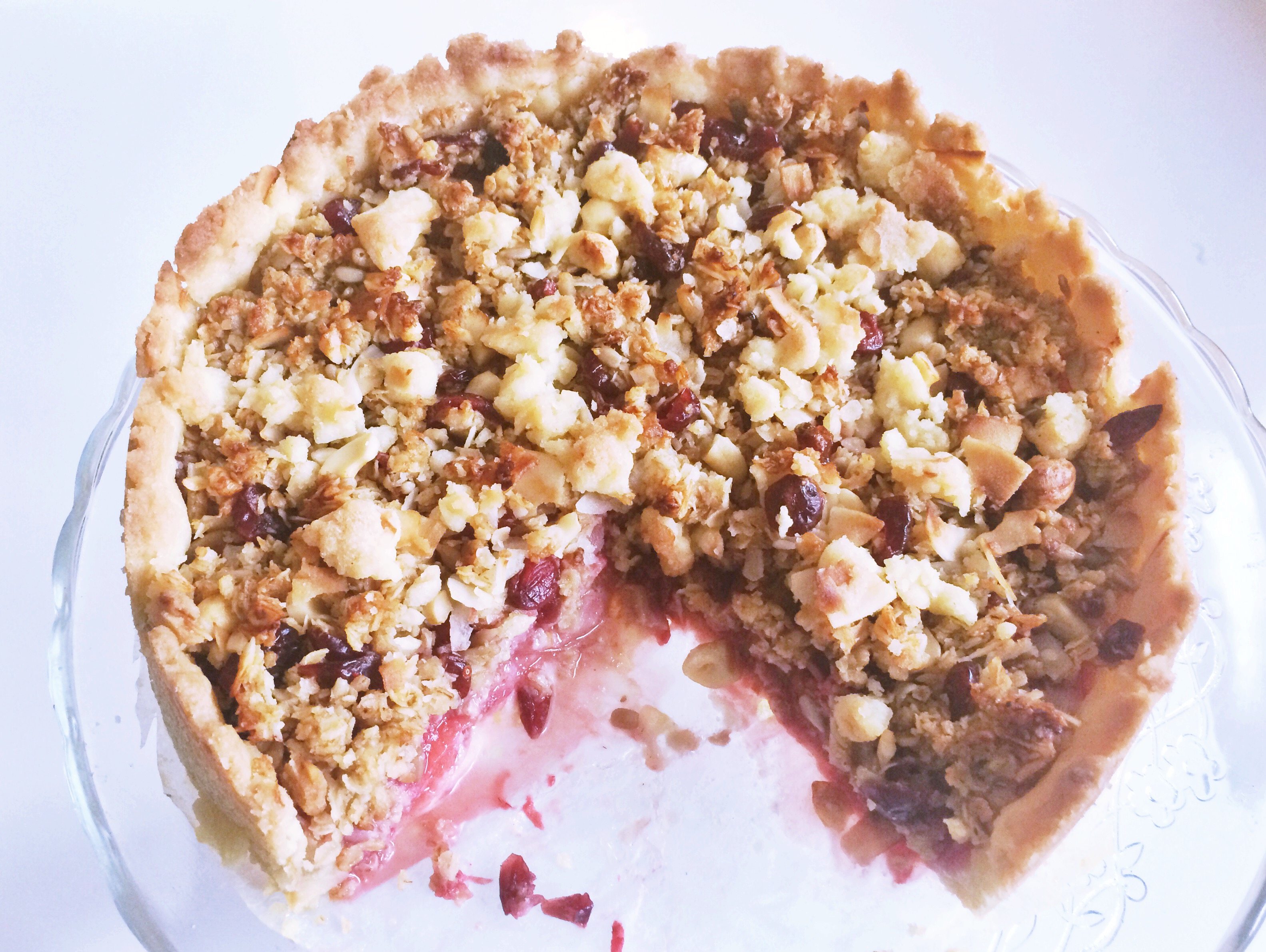 7) Nosta granola uuniin hieman keskitasoa alemmalle tasolle 200 asteeseen. Paista noin 20 minuuttia niin, että käyttämäsi hedelmät/marjat pehmenevät ja pohja paistuu kypsäksi ja saa reunoilta kauniin värin. Tarkkaile paiston aikana, että pinta ei tummu liikaa. Peitä tarvittaessa paiston loppuvaiheessa kakku foliolla tai leivinpaperilla!