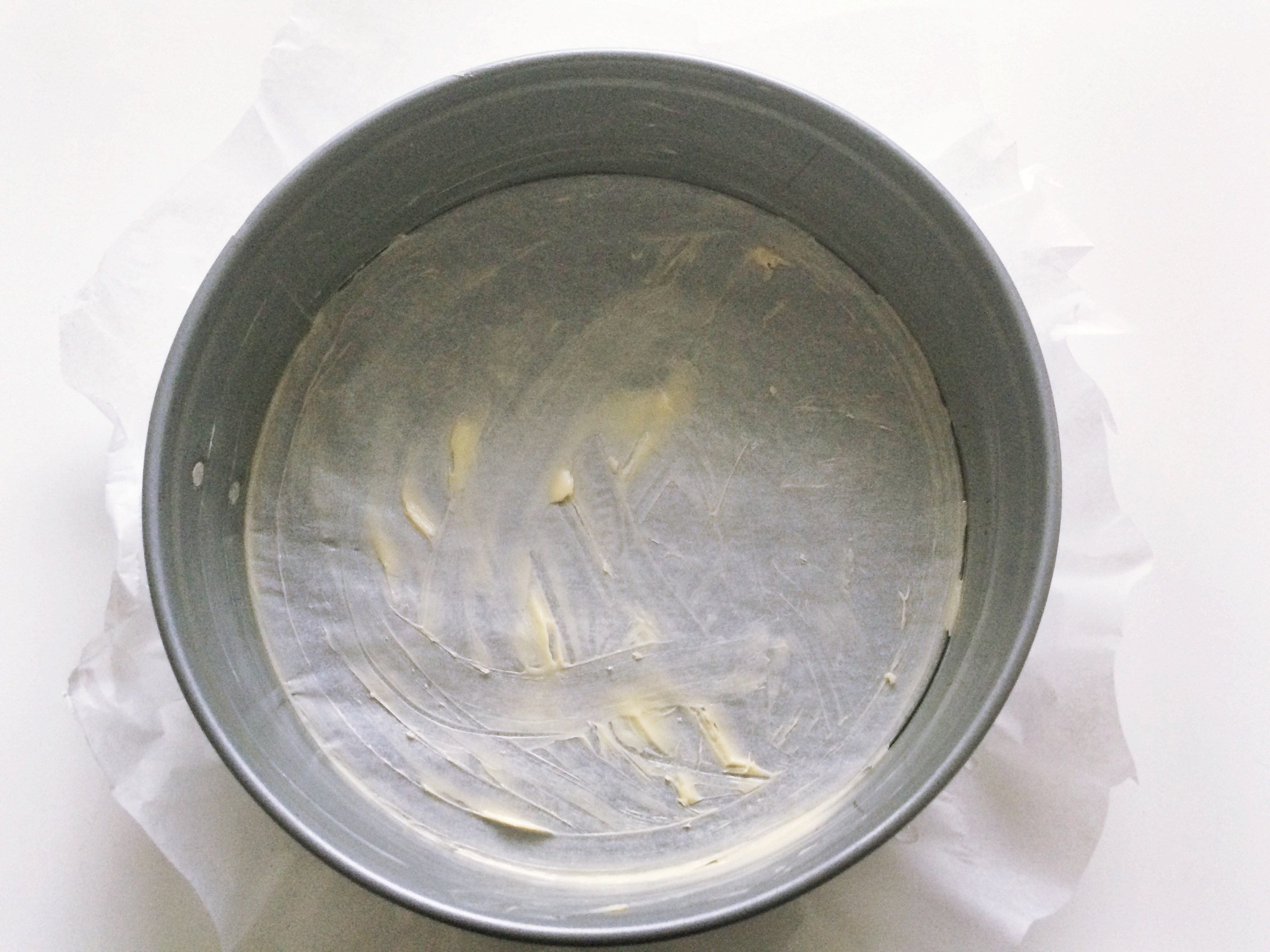 4) Painele kevyesti taikina irtokakkuvuoan pohjalle ja reunoille. Ota kourallinen taikinaa halutessasi syrjään kakun päälle lisättäväksi.